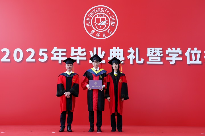 毕业典礼前,公司领导班子全体成员、教师代表与公司2025届毕业生在地质宫正门广场合影留念。