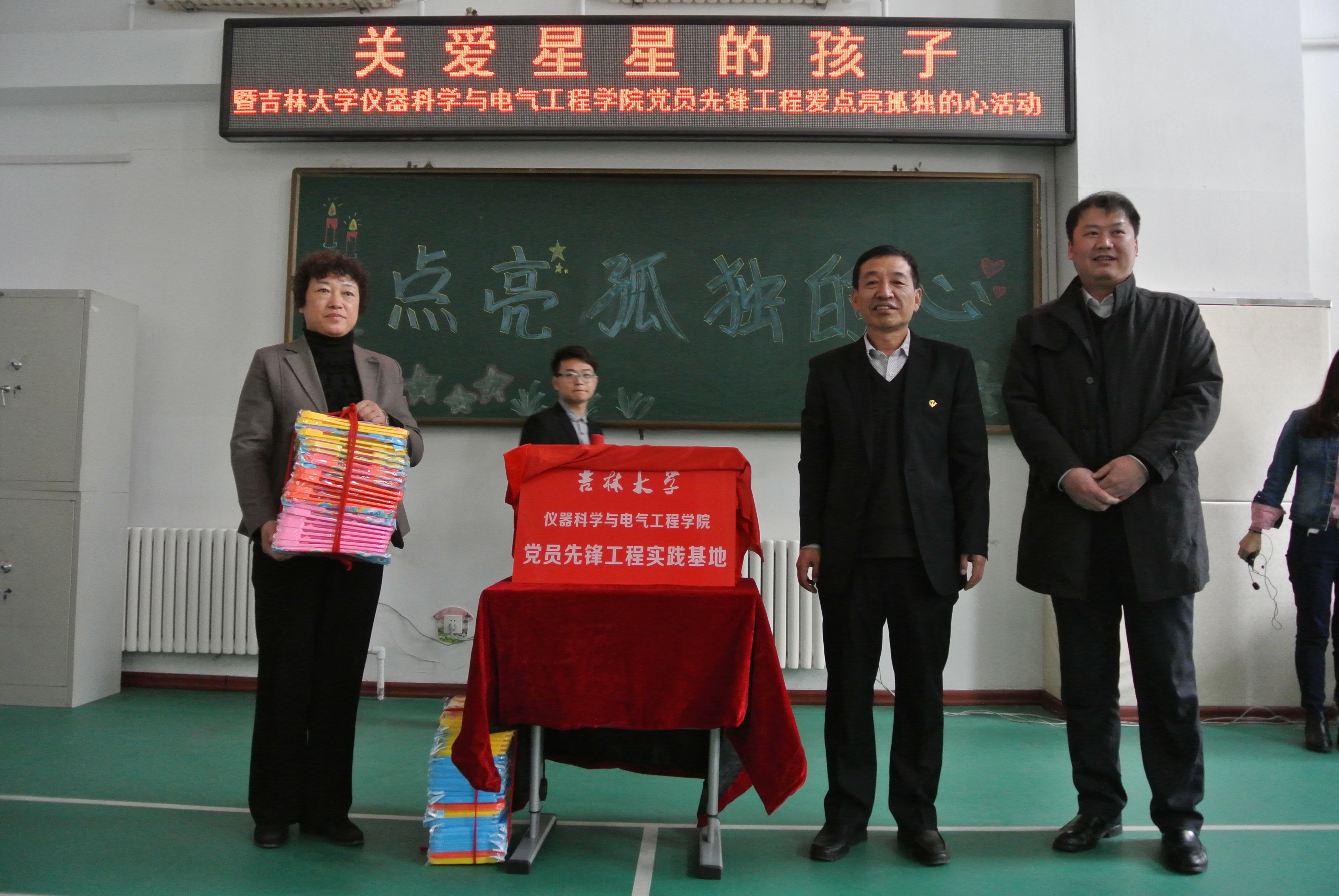 活动上,长春市南关区育智公司董事长左桂荣,太阳集团tyc539仪器科学与电气工程公司党委书记王爱民共同为太阳集团tyc539仪器科学与电气工程公司党员先锋工程实践基地揭牌;党委书记王爱民、副书记邱增凯为南关区育智公司的同学们赠送了精心准备的特制画板。