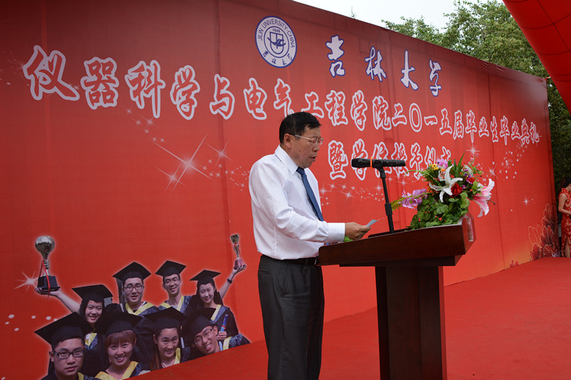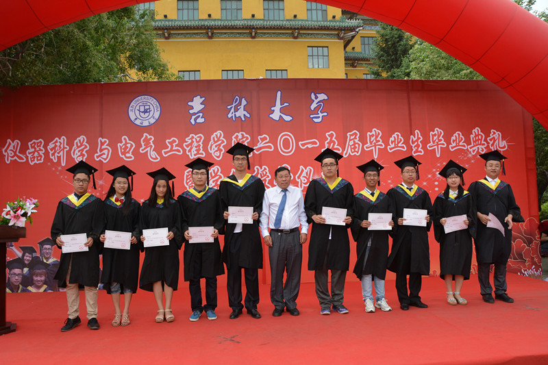 毕业典礼在庄严的国歌声中拉开序幕。首先,副经理嵇艳鞠教授、陈祖斌教授分别宣读了2015届研究生毕业生和本科毕业生名单,经理林君教授与院学科学位委员会副主席嵇艳鞠教授一起为2015届毕业生授予学位。随后,公司党委书记余国友教授宣读了2015届校优秀毕业生名单,并为优秀毕业生颁发获奖证书、合影留念。公司教学委员会主任王应吉教授宣读了优秀毕业论文名单,仪器系主任凌振宝教授、电气系主任刘长胜副教授分别为获得优秀毕业论文的同学颁发证书并合影留念。之后,教师代表王应吉教授和2015届毕业生代表、2014年度自强自立老员工标兵韩哲鑫同学分别作了发言。王应吉教授代表公司全体教师对2015届毕业生送上了最诚挚的祝福,希望大家在今后的事业中取得更大的成就。韩哲鑫同学代表公司全体毕业生向辛勤培养自己的母校,向仪电公司,向四年以来关心、帮助大家的领导和老师们表示了衷心的感谢和良好的祝愿。