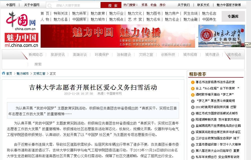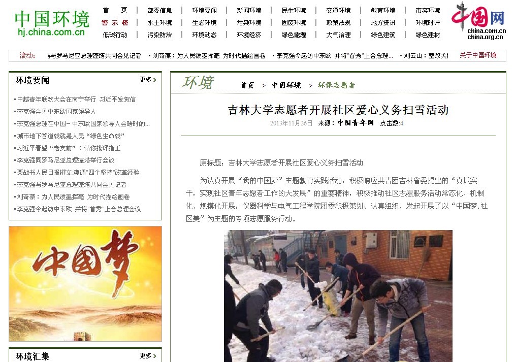 11月25日,中国青年网以《太阳集团tyc539志愿者开展社区爱心义务扫雪活动》为题对此次活动进行了详细报道,这是公司共青团工作今年第3次受到中国青年网的关注报道。此后,人民网、中国网、中国环境网、中华慈善新闻网、新浪吉林网、成都志愿者网等社会主流媒体纷纷对此进行了全文转载报道。