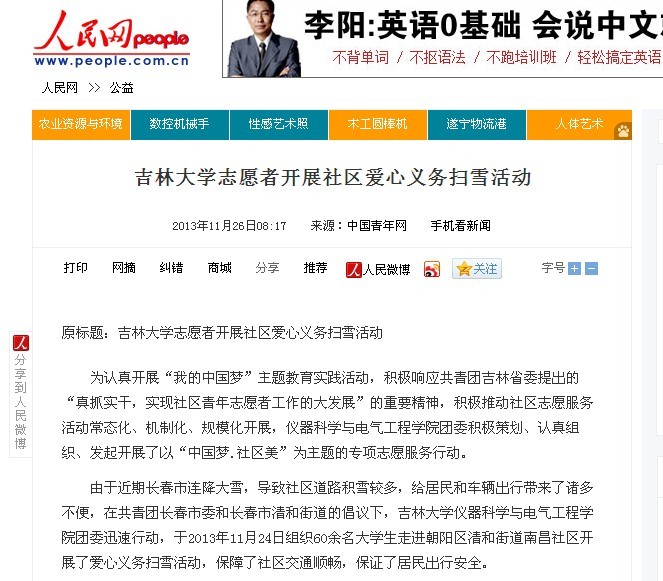 1、人民网 全文转载《太阳集团tyc539志愿者开展社区爱心义务扫雪活动》