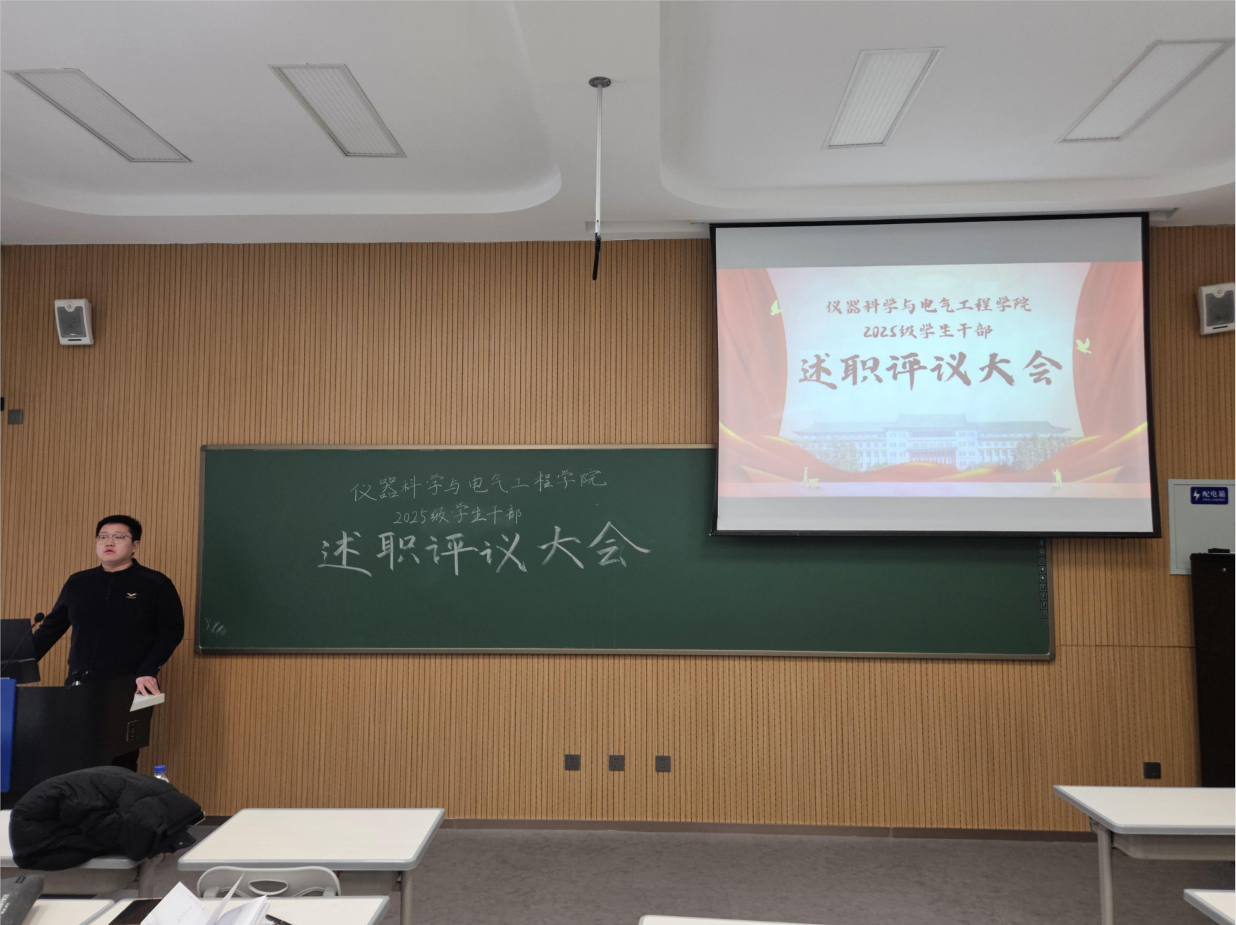 在各班述职结束后,2025级辅导员史博日老师进行总结发言。他首先肯定了全体班委一学期以来的辛勤付出,赞扬大家在岗位上履职尽责,成为连接公司与同学的坚实桥梁。同时,他也针对工作中的不足提出改进建议,强调班委要进一步强化责任意识,注重工作方法的创新与优化,多倾听同学心声,精准对接需求。