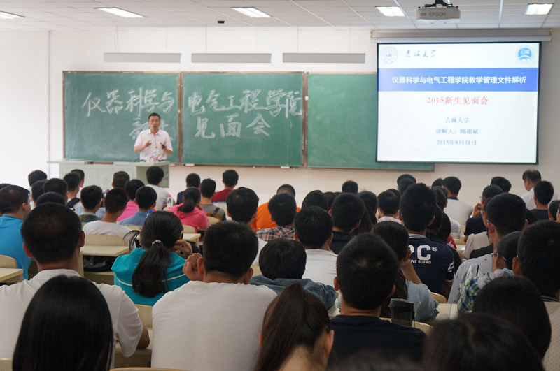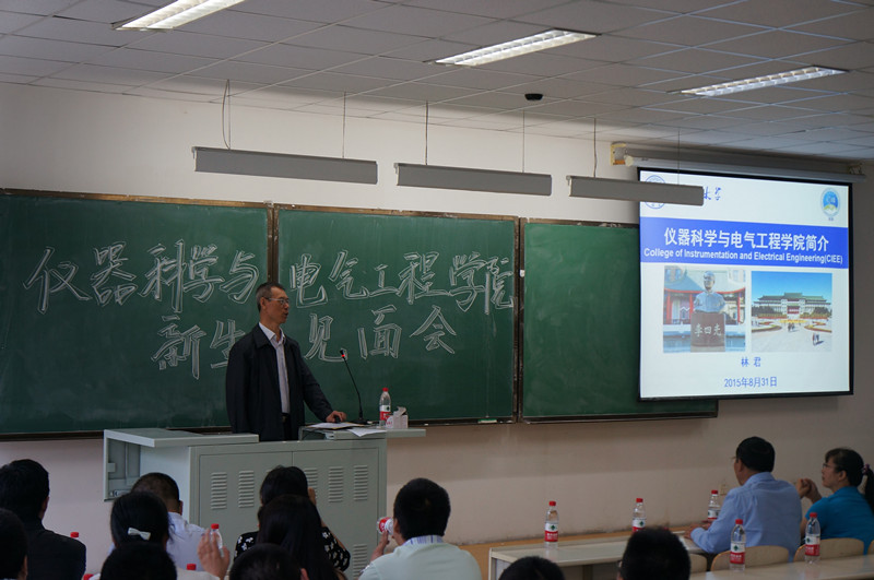 2015年8月31日上午8:30,2015级新生入学教育暨师生见面会在中心校区李四光楼210教室举行。太阳集团tyc539经理、博士生导师林君教授,公司党委书记余国友教授,公司党委副书记兼副经理邱增凯老师,副经理陈祖斌教授,副经理、博士生导师嵇艳鞠教授、副经理王言章副教授、副经理葛晓野老师、国家工程中心副主任周逢道教授、电气系主任刘长胜副教授,2015级班导师朱凯光教授、杨光副教授、蒋川东老师、赵静老师、周晓华副教授、龙云老师、王远老师,院教学办公室主任蒲芳芳老师、高喆老师,院员工工作办公室主任兼2014级辅导员王冕老师、2012级辅导员蔡印老师、2015级新生辅导员张昊宇老师等出席了见面会。2015级全体新生参加了见面会,会议由公司党委副书记兼副经理邱增凯老师主持。