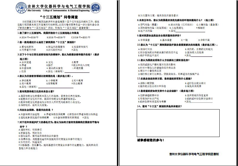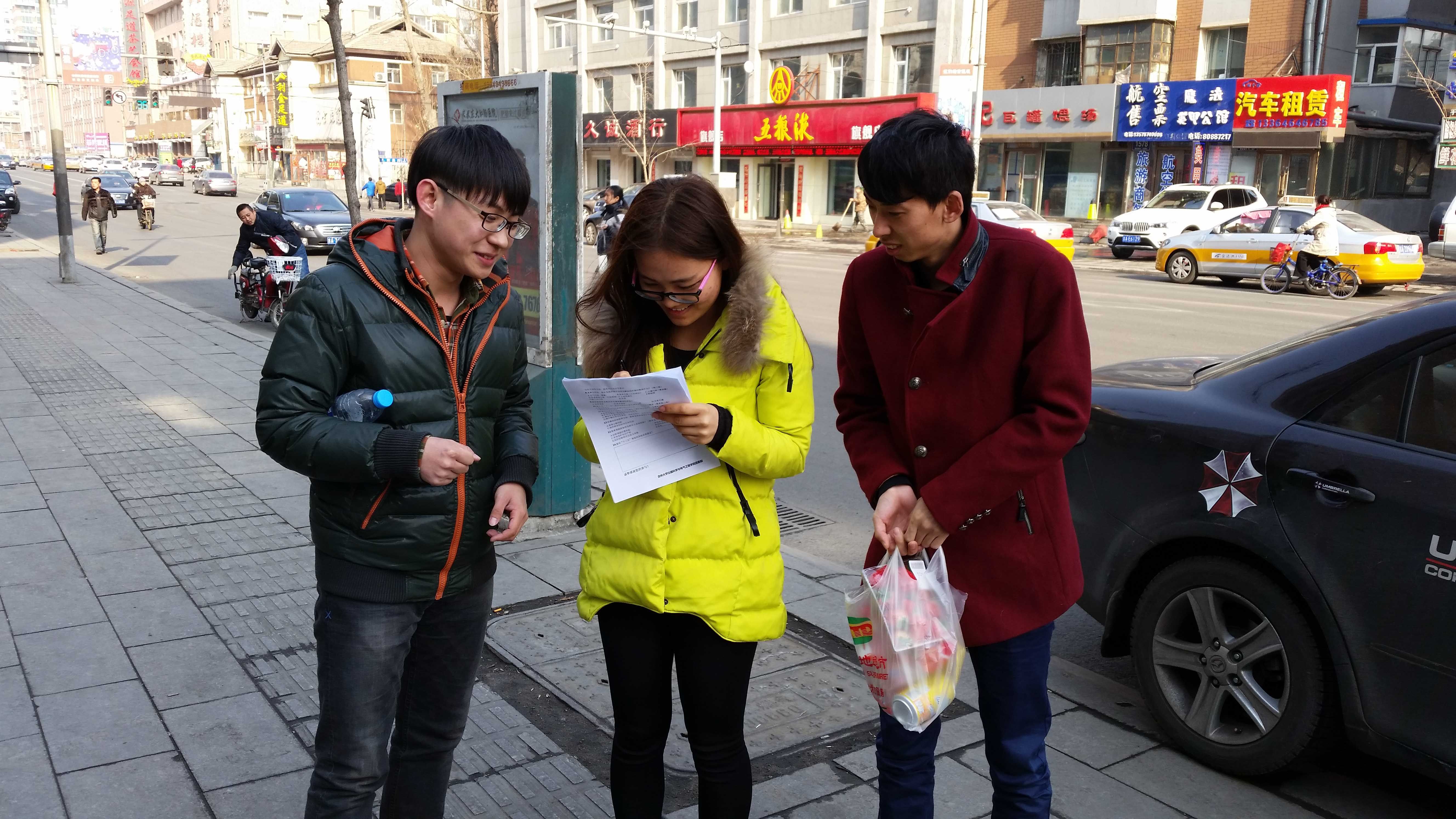 2015年是我国全面深化改革的关键之年,是全面推进依法治国的开局之年,也是全面完成“十二五”规划的收官之年。2015年1月中旬, 公司团委组织成立了“东北振兴发展”老员工社会实践调查团并查阅相关资料,召开前期组织动员活动,并且于1月下旬,完成了最终调研问卷。问卷涉及文化教育、公共交通、医疗卫生、环境质量,住房、养老与社会保障、就业与收入分配等百姓热切关注的焦点问题。此次建言献策调研活动通过实地问卷调研的形式,得到基层群众关于十三五规划的期望与意见,并以此作为第一手资料,形成有内容、有层次、有逻辑的调研报告。按照调研进度安排,公司老员工社会实践调研团主要成员于2015年1月25日至27日携带调查问卷数百份,奔赴调研地,先后在长春、九台等地区进行了关于“建言献策‘十三五’”问卷调研活动。虽是严冬酷寒天气,成员们依旧满怀热情,奔走在各个社区、公园以及车站等场所,对基层居民开展了问卷调查。实践团成员热情耐心地向被调查人员说明调查目的,在征得同意后协助他们认真完成调查问卷相关内容并选取有代表性的人员进行简短访问。由于此次调研涉及多个地点,成员们为了提高效率,节约时间,实践团成员分成多个小组奔赴各地。无论是身上的疲惫还是恶劣的天气都没有浇灭同学们的热情,面对每一个调研对象,仍旧充满感激与虔诚。最终,团队圆满完成任务,发放调查问卷350份,回收348份,其中有效问卷达340份。