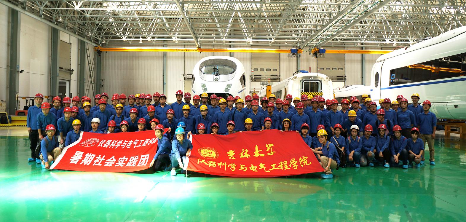 当天上午8:30,实践团全体同学在老师的带领下统一乘车去往长春轨道客车股份有限公司。经过近一个小时的车程,实践团一行安全抵达客车厂。参观前,工厂的工作人员向同学们介绍了长春轨道客车股份有限公司的发展历史,通过介绍,同学们了解到中国目前最先进的轨道客车都将在此生产下线,厂内目前主要生产即将运行的哈大线380型号动车以及地铁用车。跟随者工作人员,师生一行来到车体生产车间,在宽敞的车间里,停放着高速动车组的车体骨架,经介绍,车体采用铝型材料,强度大、质量轻,适合用作高速列车的骨架,同学们现场观看了车体的成型工序,惊叹于加工技术的精细与卓越。之后,同学们参观了动车组的车体线路铺设车间,见识到了工厂生产的高标准与高安全性,保证了每辆车能够出厂的客车百分百的达到安全标准,同学们从这些技术员工的身上看到了精益求精的可贵品质。