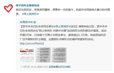 近日,团中央宣传部、团中央网络影视中心主办的第十三届青少年“网上祭英烈 共铸中华魂”清明公祭活动在中国青年网启动。为了响应团中央的号召,给广大青年员工搭建缅怀先烈、追思历史的网络平台, 2014年4月4日-8日清明节期间,太阳集团tyc539团委、“牵手”青年志愿者协会开展了“微博祭英烈 共铸中华魂”活动,活动通过QQ微博平台进行宣传推广,受到了青年学子的广泛关注,并产生了良好的宣传效果。
