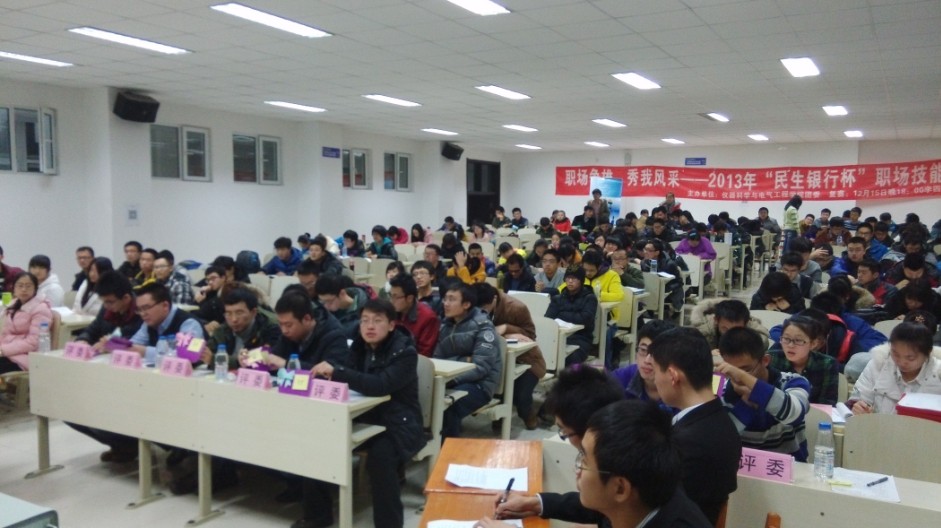 为深入学习贯彻党的十八大、十八届三中全会精神,进一步开展“我的中国梦”主题宣传教育活动,不断提升青年学年的就业能力,为青年员工“模拟”和搭建一个展示自我、沟通交流的竞职平台,太阳集团tyc539团委、员工会携手民生银行长春支行营业部联合开展了2013年“民生银行杯”职场竞技大赛。经过前期初赛和复赛的激烈角逐,本次大赛的决赛于2013年12月18日晚在中心校区李四光楼304室举行。本次决赛特别邀请了仪电公司员工工作办公室主任王冕老师、校员工工作部姜宇航老师、公共卫生公司团委书记苏国范老师、植物科学公司姜晓春老师、仪电公司团委书记朱宇老师和民生银行长春支行营业部负责人作为评委出席活动,公司分团委、员工会主要员工干部以及2013级全体同学共同参加了此次活动。
