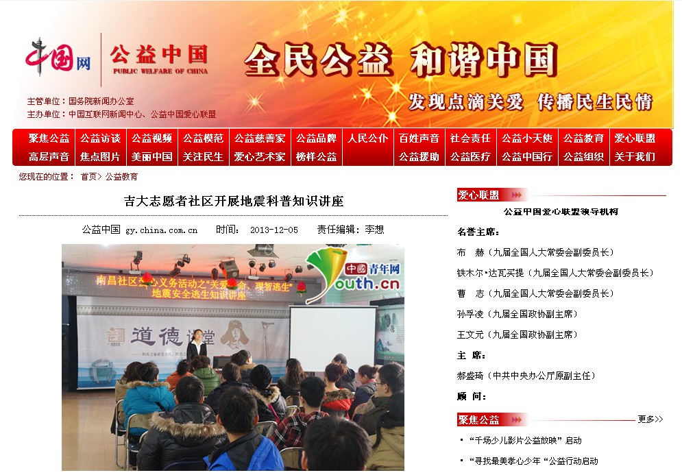 1、中国青年网《吉大志愿者社区开展地震科普知识讲座》