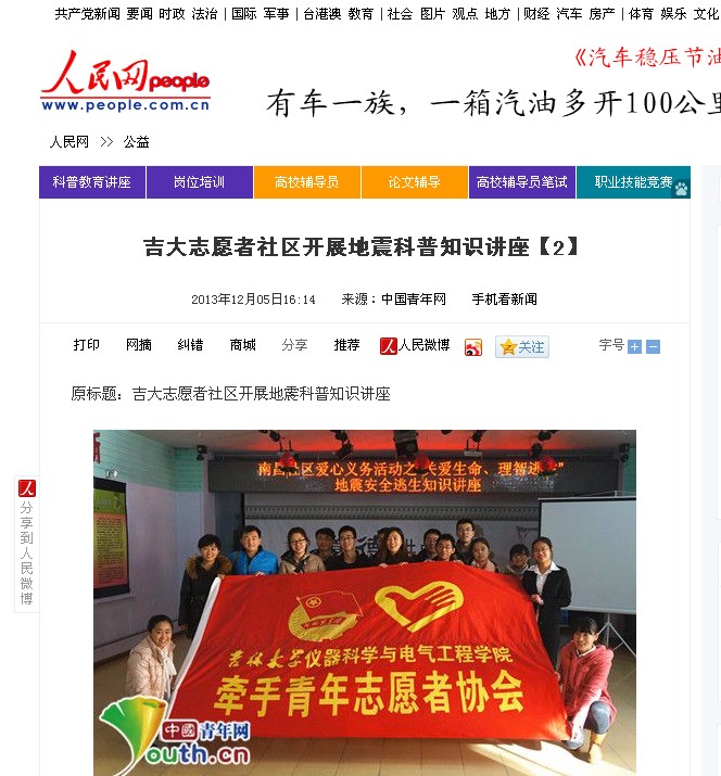 2、人民网全文转载《吉大志愿者社区开展地震科普知识讲座》