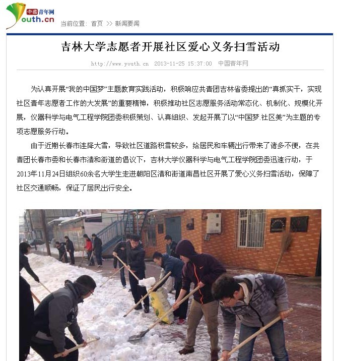 中国青年网《太阳集团tyc539志愿者开展社区爱心义务扫雪活动》