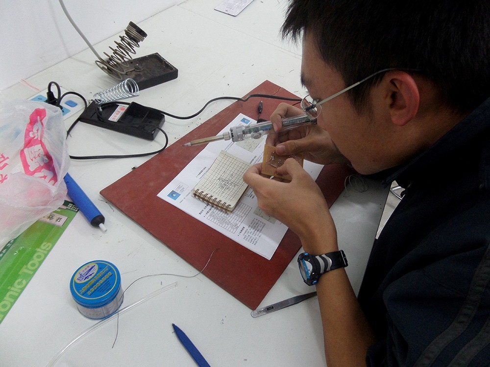 此次培训的主要内容是焊接红外感应出水器电路板,相比之前基础技能的训练,其操作难度有了明显的加强。首先,由科技协会原会长、2013级硕士研究生周鹤同学为大家演示已焊接好的红外感应出水器成品并详细讲解了其工作原理。他着重强调了此次电路焊接的重点难点以及操作过程中的注意事项,同学们都认真的听讲并做了详细笔记。之后,2012级会员为大家分发所需元器件并在一旁耐心指导。大家全神贯注、认真细致,积极讨论、虚心好学,协会骨干成员亲切指导,对在场同学的疑难困惑一一进行了解答。