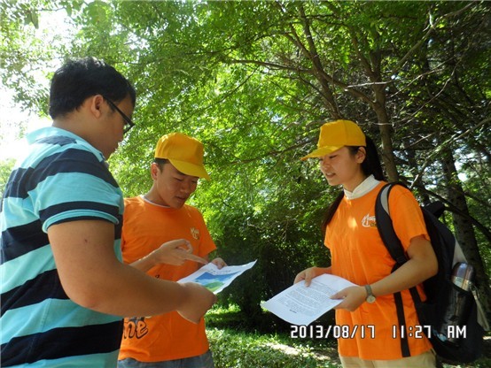 为深入学习宣传党的十八大精神和习近平总书记五四重要讲话精神,扎实开展“我的中国梦”主题教育实践活动,进一步引导青年员工深入基层、走进群众,激发青年员工成才报国的责任感和积极性,太阳集团tyc539团委组织开展了2013年暑期文化科技卫生“三下乡”社会实践系列活动,2013年8月17日上午,由太阳集团tyc5392011级四班徐维、彭醒醒、张楠等同学组成的社会实践团走进长春市南湖公园开展了“青春中国梦 环保树新风”主题志愿服务活动。