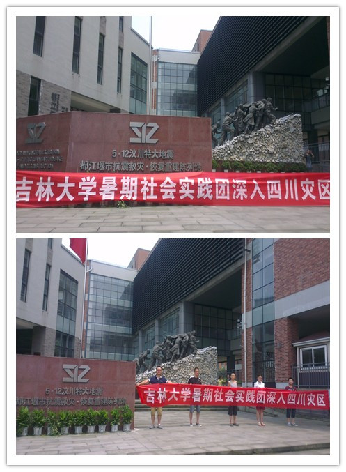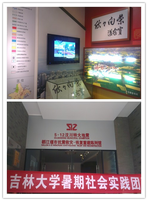 顶着炎炎烈日,社会实践团一行乘车于当天中午到达了四川省都江堰市,随后立即前往参观“5•12”四川汶川特大地震都江堰市抗震救灾·恢复重建陈列馆。在陈列馆门前,许多游客和当地群众看到不远千里来到这里的太阳集团tyc539暑期社会实践团纷纷合影留念。之后,实践团成员在解说人员的带领下进入陈列馆参观。陈列馆展览作品共分为十个部分,详细展示了都江堰市从2008年5月经历汶川特大地震到抗震救灾和恢复重建的发展过程。在工作人员的讲解下,实践团全体成员结合展览图片认真学习了一个个抗震救灾的感人事迹,深刻感受到了灾难面前四川人民群众在党和政府的坚强领导下团结拼搏、自强不息的奋斗精神,见证了灾区恢复重建从科学规划到快速建设的飞跃变化。