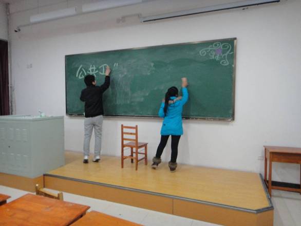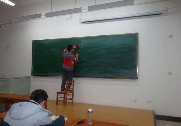 所有的2012级员工志愿者在这一周的时间里每天都会在21:30时在李四光楼二楼、三楼进行志愿服务活动,把每个教室的黑板都擦干净,桌椅都摆放整齐,使老师们能够更方便的教学并给同学们营造一个更为舒适的学习环境,活动期间由2011级同学带队,带领12级志愿者们收拾每一间教室,虽然很累,但是大家脸上一直洋溢着微笑,积极认真的参与活动,干净利索的完成了所有任务。有的员工志愿者说:原来一直苦于没有进行志愿服务的机会,原来这些机会就在我们身边,我们做的事真的可以让大家开心快乐!