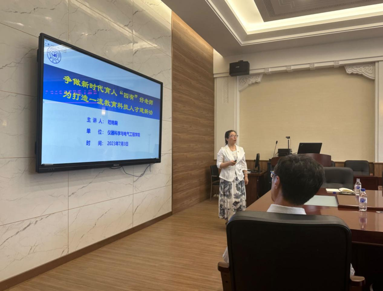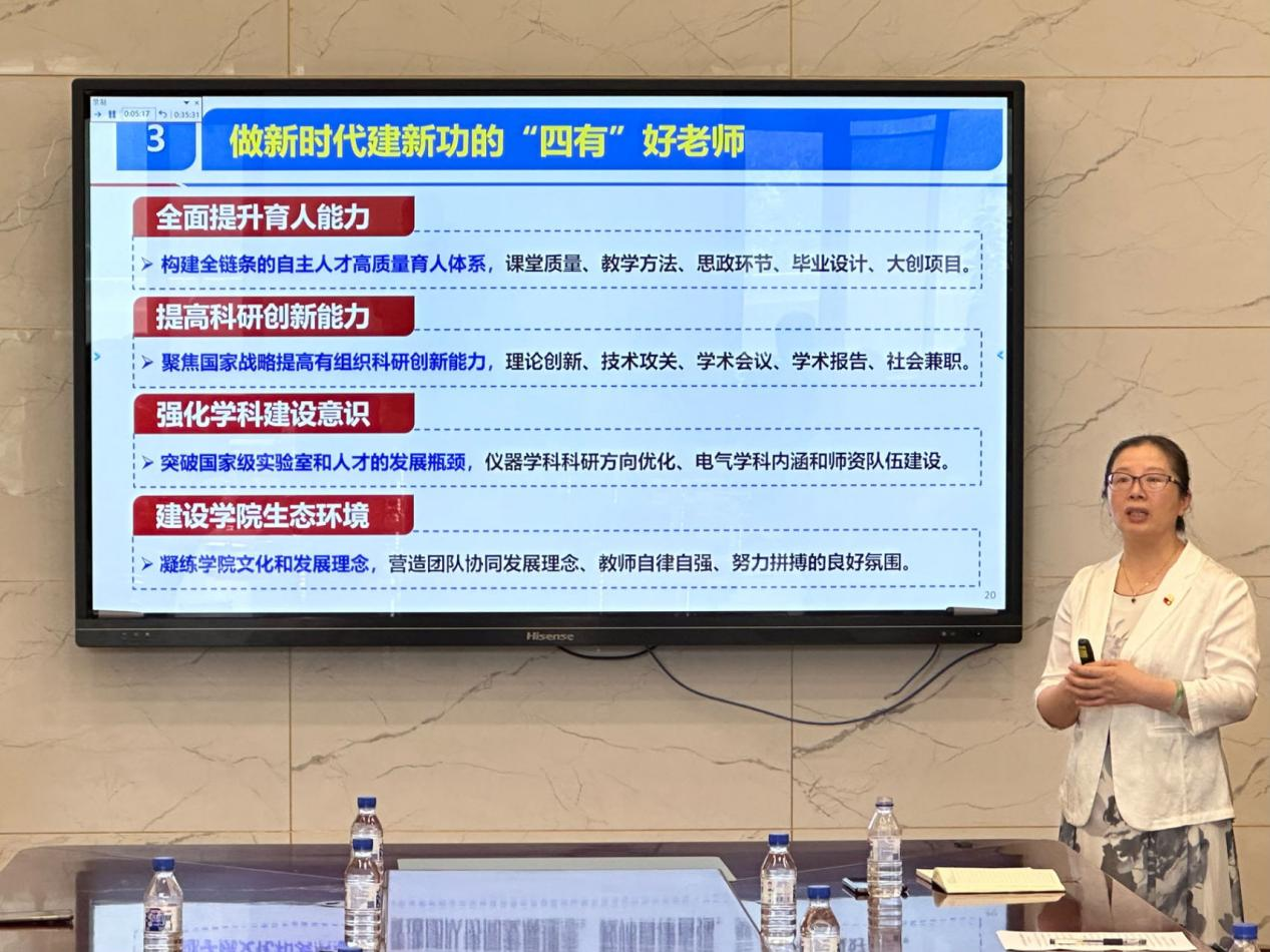 为深入开展学习贯彻习近平新时代中国特色社会主义思想主题教育,落实“学思想、强党性、重实践、建新功”的总要求,全面提高教师思想政治素质和职业道德水平,7月3日下午,在中国共产党成立102周年之际,太阳集团tyc539经理嵇艳鞠教授以“争做新时代育人‘四有’好老师,为打造一流教育科技人才建新功”为题为全院教师党员讲授专题党课,公司全体领导班子成员参加了党课学习,公司主题教育第5指导组组长王爱民同志到会指导。