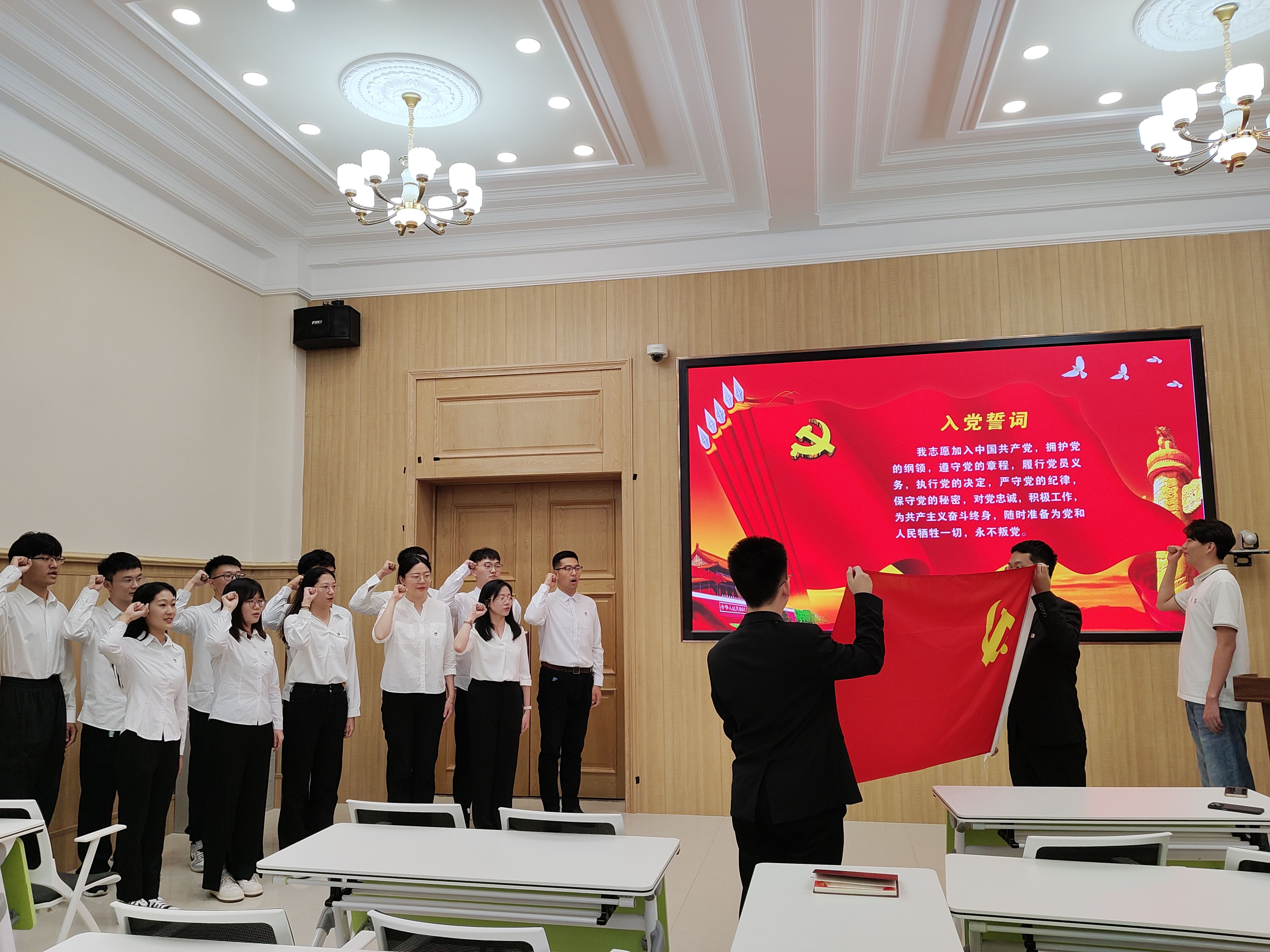 仪式在庄严的《国际歌》中拉开了序幕。刘颜达同志宣读预备党员名单,并对新入党的同志表示热烈的祝贺。宣誓仪式上,12名新党员胸戴党员徽章,高举右拳,面对鲜红的党旗进行了庄严宣誓,共同许下为共产主义奋斗终身的誓言。党支部党员同志也一同重温了入党誓词。
