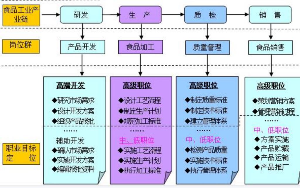 漯河作为首批中国食品名城,食品制造业是漯河市的主导和支柱产业。为加快推动食品制造产业转型升级,2019年,漯河市出台了《关于漯河市中国食品名城建设的实施意见》;2021年,河南省农业农村厅印发了《打通以双汇为骨干的漯河市食品产业链工作方案》,市委市政府要求以集群发展延伸产业链、以创新发展提升价值链、以融合发展打造供应链,探索“三链同构、农食融合”的发展模式。作为地方高职院校有义务主动对接区域经济产业链,发挥自身专业优势,为区域经济的发展服务。结合食品专业与产业链融合发展需要,组建以食品智能加工技术专业为核心专业,辐射食品检验检测技术、食品药品监督管理、食品质量与安全和中西面点工艺等专业的专业集群,专业群涵盖了食品研发、食品智能加工、生产管理、品质管理和产品检验等产业链。