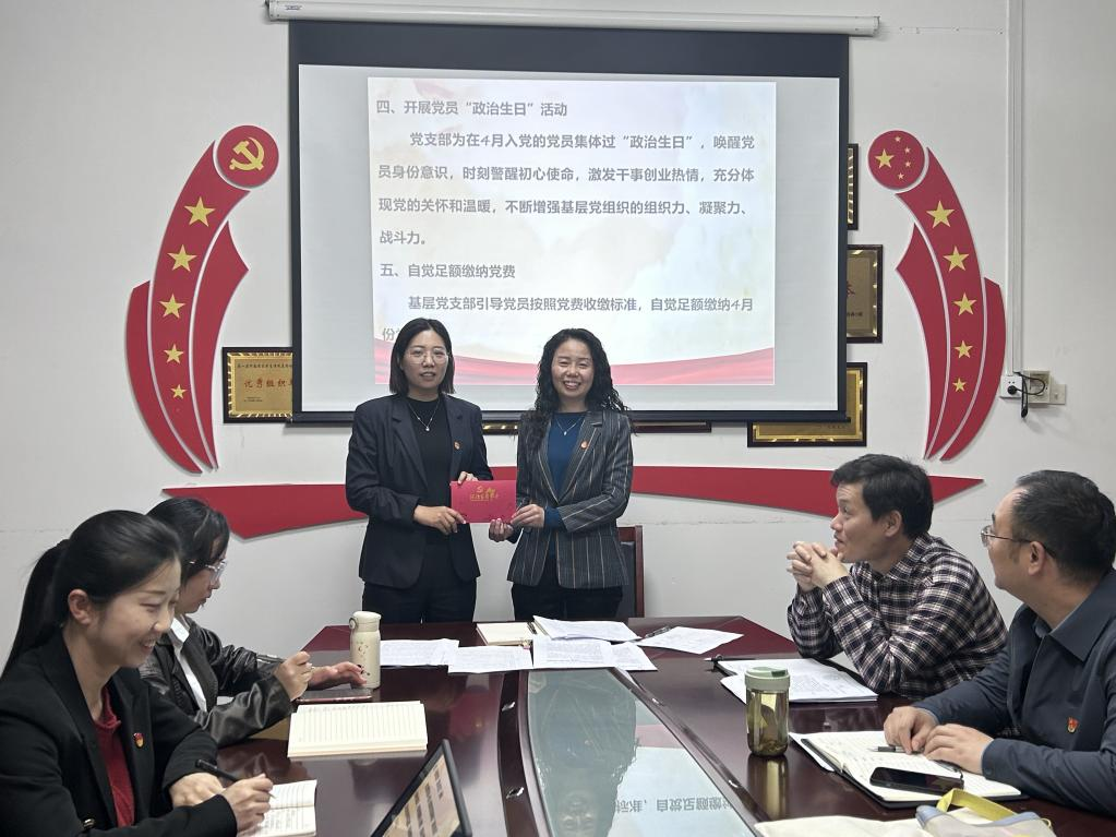 会议中,教工党支部书记贾娟同志带领全体党员同志集体开展专题学习,主要学习了新修订的《中国共产党纪律处分条例》、《中华人民共和国保守国家秘密法》、中原大讲堂“发展新质生产力”主题学习报告会会议精神等内容,激励每位党员遵纪守法,严格要求自己,积极发挥先锋模范作用,认真履行党员义务,做新时代优秀职业教育教师。同时,支部开展了党员“政治生日”活动,集体为在4月入党的侯鹏飞同志过“政治生日”,唤醒党员身份意识,时刻警醒初心使命,激发干事创业热情,充分体现党的关怀和温暖,不断增强基层党组织的组织力、凝聚力、战斗力。最后,王新娜同志传达了公司相关的会议精神,她指出,“广大党员要立足教书育人本职工作,积极开展理论学习,不断提升思想政治水平,加强思想引领,做好双承诺、双报到、双结对工作,提升业务能力,在业务工作中和服务人民群众的工作充分发挥党员先锋模范作用”。