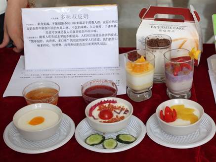 作品介绍:本产品在原有的双皮奶中添加不同水果,不仅奶味浓郁、入口香滑,口感细腻,而且具有提高免疫力,降血压、有利于生产发育等作用。可以满足不同人群的喜好。