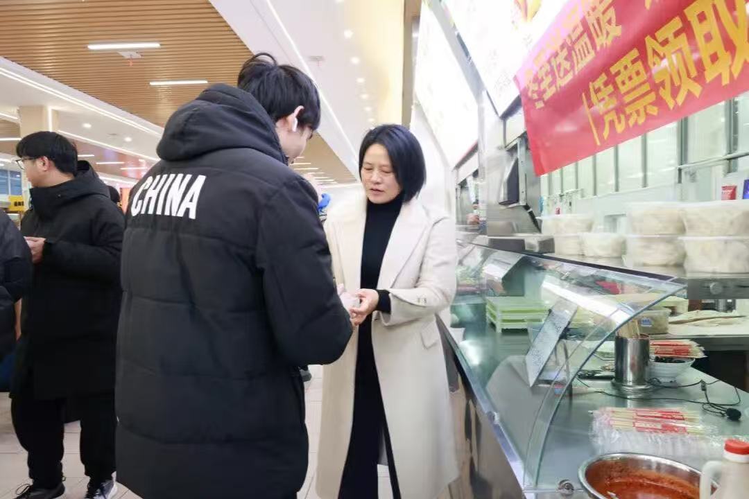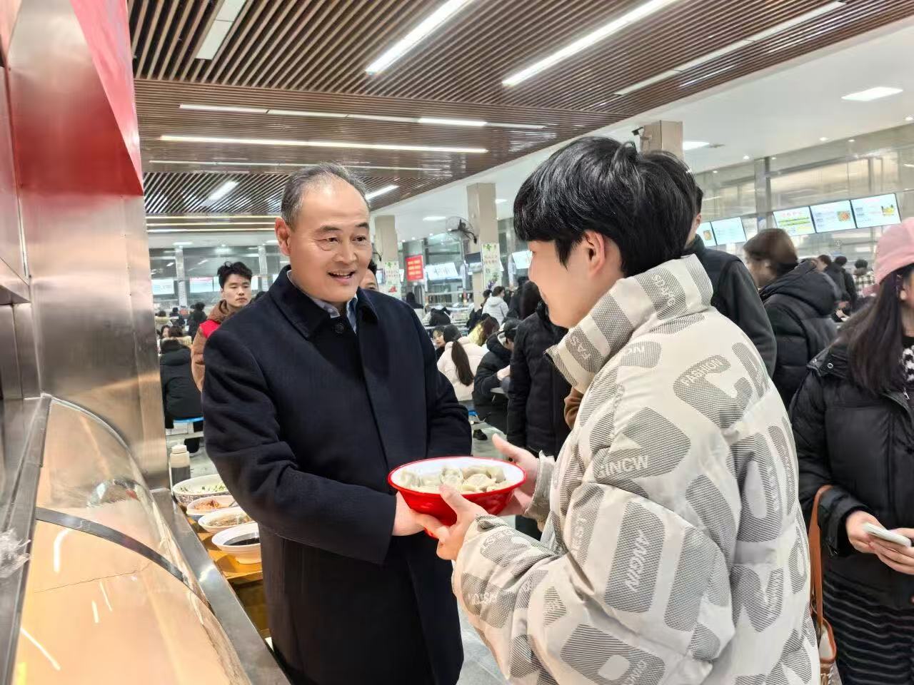 校领导将一碗碗满载爱意的饺子送到同学们手里