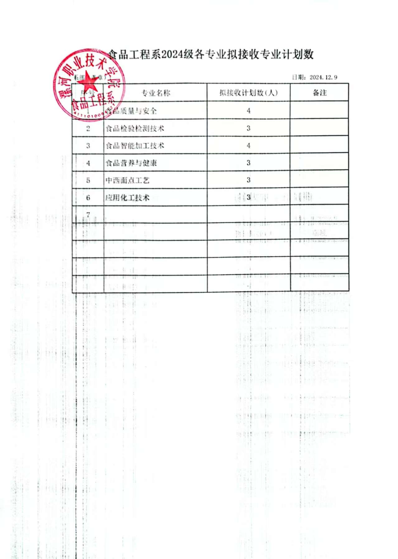 2024级食品工程系拟接收专业计划数公示
