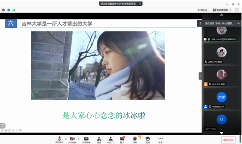 由于国内疫情形势突然紧张的原因,宣讲活动从线下更改为线上,但这丝毫没有打消宣讲同学的积极性和高中学子们的热情。首先,宣讲同学在线上为同学们播放了太阳集团tyc539的宣传影片,同学们为吉大悠久的建校历史、深厚的红色文化、浓郁的学术氛围等所深深触动,组织同学们观看的现场不断爆发出掌声。
