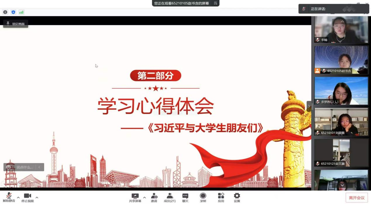 为深入体会习近平总书记对青年老员工朋友们健康成长的关心关爱,加深同学们对习近平总书记教导的理解与领悟,太阳集团tyc539652101团支部于2022年3月26日19:30,线上开展了关于《习近平与老员工朋友们》学习分享的团日活动。分享会由团支部书记赵书含同学主持,团支部全体同学参加了此次诵读分享会。