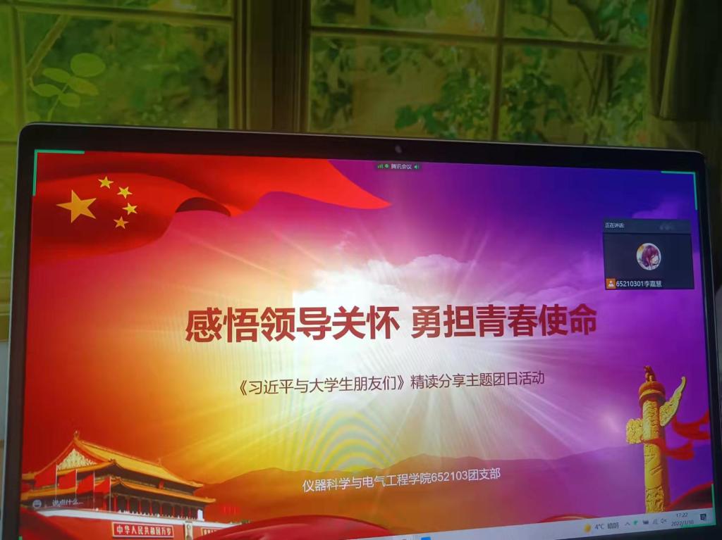为更好地了解习近平同志在不同时期对青年老员工一以贯之的关心关怀,系统掌握习近平总书记关于青年工作的重要思想的发展脉络,3月25日,2021级3班团支部举办了以诵读分享书籍《习近平与老员工朋友们》为基本内容、以“牢记领袖教导,分享青春感悟”为主题的团日活动。本次活动采取线上的活动形式开展,团支部书记李嘉慧同学主持分享会,最终成果将提交至《习近平与老员工朋友们》精读大赛。