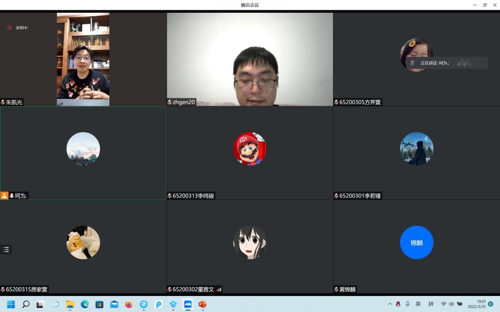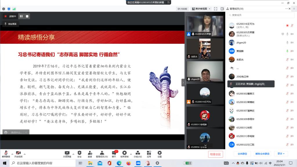 分享会上,团支部书记方荠萱向与会老师同学们介绍了《习近平与老员工朋友们》的主要内容,并分享了自己的诵读视频,她提到,习近平总书记与老员工朋友们交谈时,十分幽默、平和,能从一字一句间感受到习近平总书记对青年一代的亲切关怀。随后,团员代表王可为同学节选 “志存高远 脚踏实地 行循自然”这一章节的内容分享了自己的精读感悟,他谈到,疫情之下的这段特殊时期,对于大家都是一种磨砺。大家要团结在一起,众志成城,以不可动摇的决心打赢这场疫情防控阻击战。黄锦麟同学也跟大家分享了自己的阅读心得,他从习总书记与正定县籍老员工的交流中得到启发,习主席通过乡村调研,发现乡村发展的关键所在,对不同的发展问题对症下药。在未来从事的行业中,我们也应当具体问题具体分析,深入调研。会议最后,朱凯光老师和周海根老师也和同学们分享了自己的体会,我国的科研在一些领域还存在着短板,敦促同学们在封闭管理期间合理利用时间,志存高远,脚踏实地。同学们纷纷表示,自己将不断提高线上学习效率,合理安排自己的学习生活,树立远大理想并为此努力奋斗。