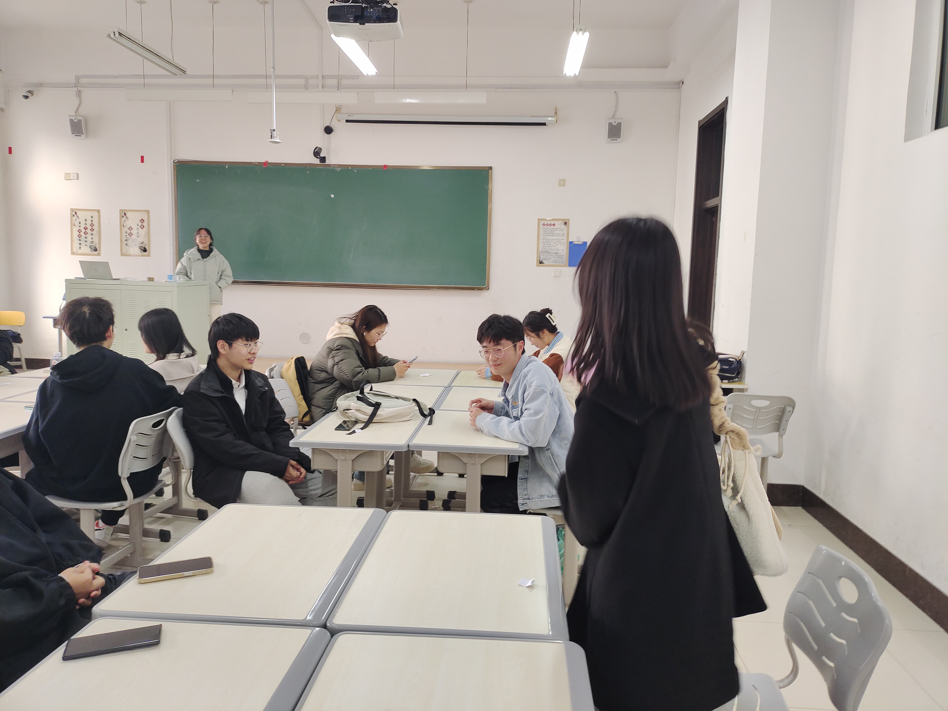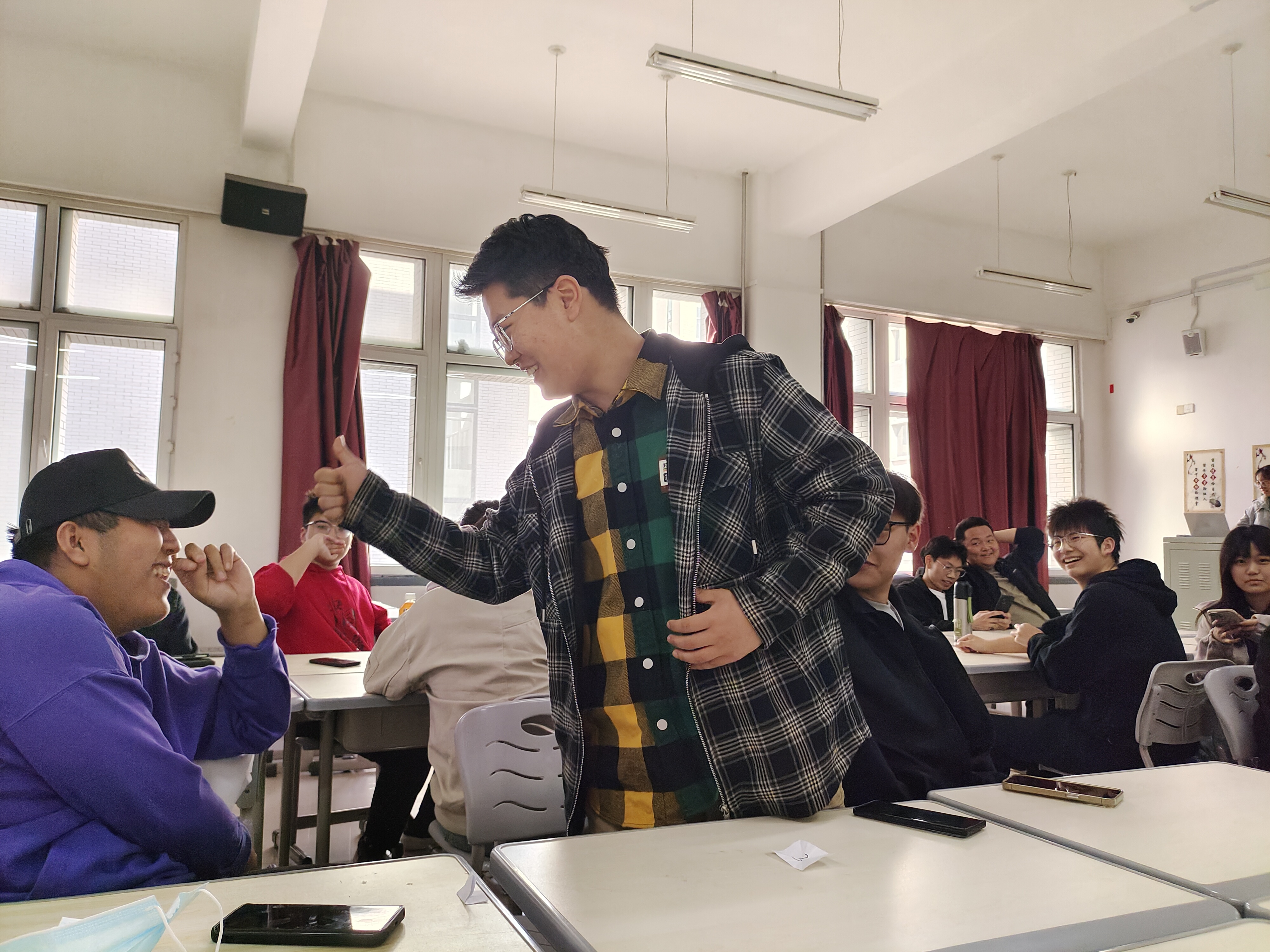 活动由班级心理委员董心怡同学主持,活动开始,通过抽签进行分组,活动暖身阶段,全体同学起立面向讲台,进行肢体放松,由主持人说出相应动作并示范,同学们进行与此相反的动作,经过一阵热身,同学们放松了身体并全身心进入了活动状态。紧接着,为了让参与者在沟通中表达情感、辨识情感,活动来到了情感传递环节,通过接龙的方式,让每一组的同学互相描述彼此在心中的人物印象。游戏阶段,同学们在小组中感受愉悦轻松的气氛,展现合作的魅力,活动也接近了尾声,同学们收获了快乐与放松,在欢声笑语中增进了彼此的默契,在小组比赛中增强了团结感。