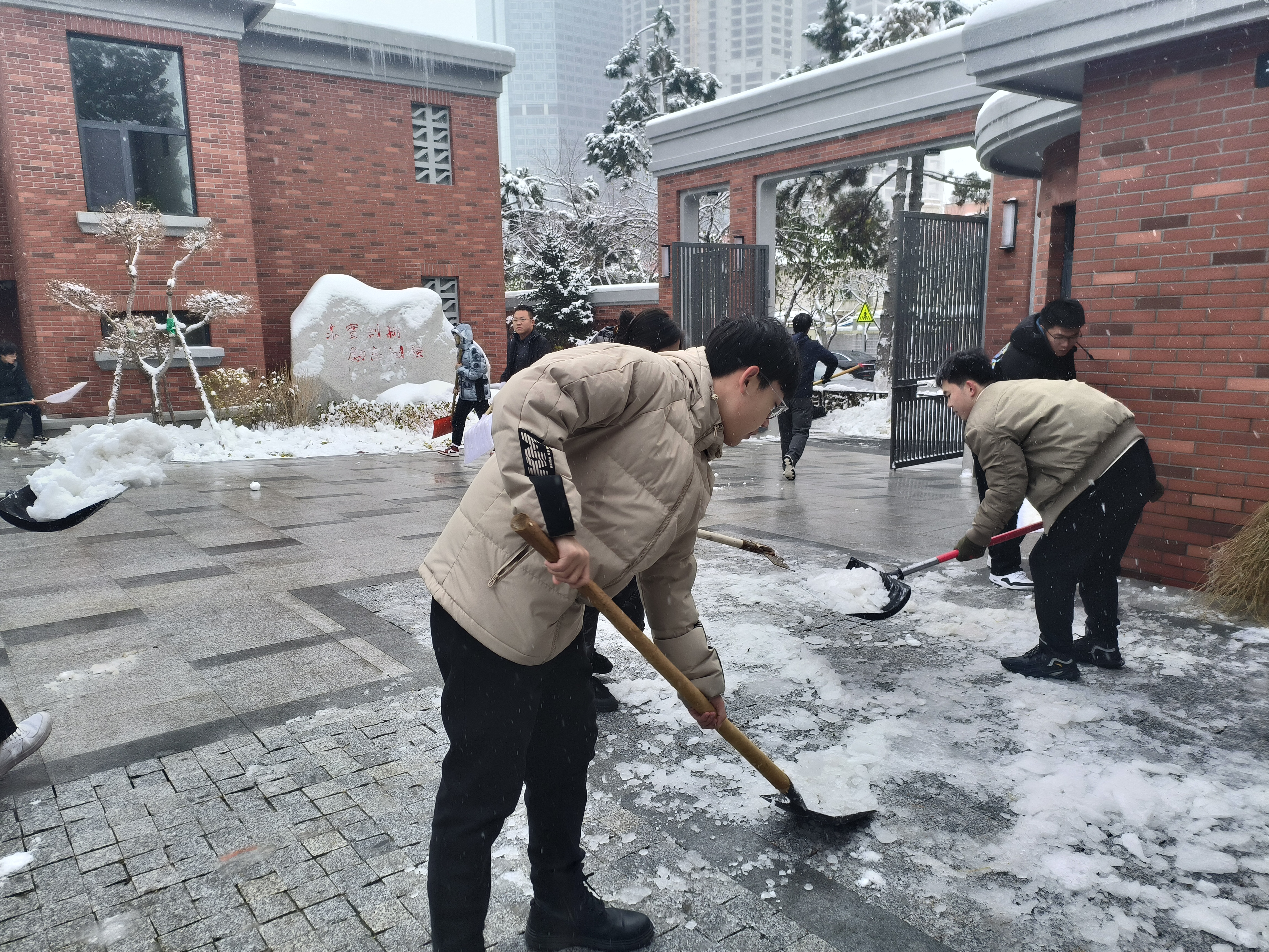 由于此次降雪持续时间长,导致路面积雪较多较厚,为大家的扫雪工作带来了许多困难。但是大家分工明确、团结协作,发扬雷锋精神,不怕苦、不怕累,铲雪、扫雪、装雪、运雪,认真细致地完成每个环节。虽然天气寒冷,许多同学的脸和手都冻红冻僵了,但是大家热情似火、干劲十足,路面积雪很快就被大家清扫干净。看着馆前道路慢慢恢复了原先的整洁,大家的脸上也露出了开心和满足的笑容。