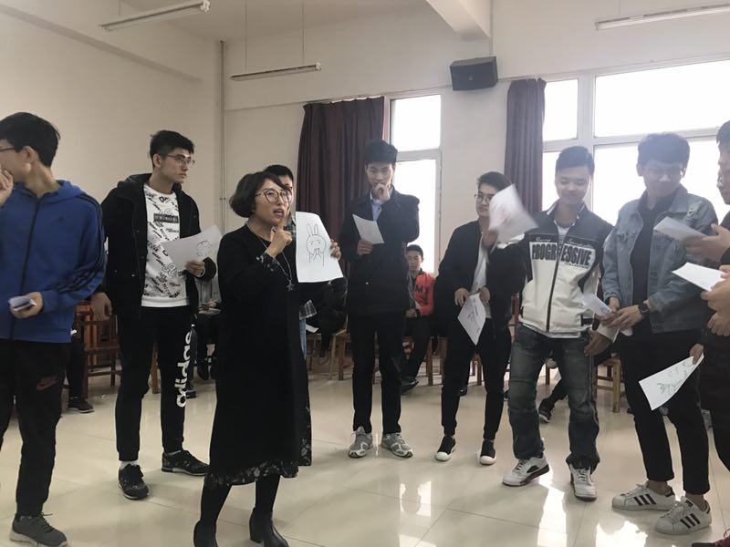 “音乐圈”活动结束之后,白老师给每位同学分发了一张白纸,要求大家画出和自己相像的动物,画出了相同动物的人分做一组,互相说出对方不适合这个小动物的理由。通过这样一个简单的游戏帮助大家认识自己,同时也更好地了解他人。之后,王老师在大家中间摆放了一个象征学年的凳子,让大家跟随自己的想法走到自己愿意离这把凳子的距离。起初大家还不太敢走,在老师的鼓励下,大家依次走到了自己心中认为合适的距离。这个游戏使同学们懂得要为自己的老员工活定一个小目标并努力接近它,这样学习才有动力,生活才有方向!最后,本次心理活动在大家手拿写有祝福语的彩色卡纸的镜头中落下了帷幕。
