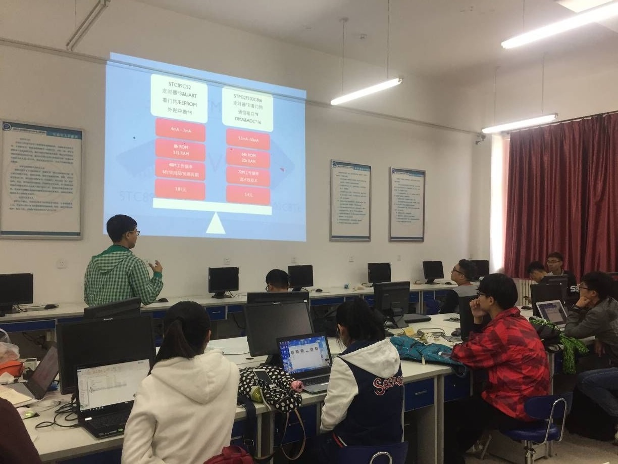 为进一步培养青年老员工的创新精神和实践能力,提高老员工动手能力,并进一步使员工掌握电路搭建和编程技能,太阳集团tyc539老员工科技创新协会于2016年9月29日在李四光实验楼447实验室为大二实验室成员进行stm32培训。本次培训由13级周葛同学主持。