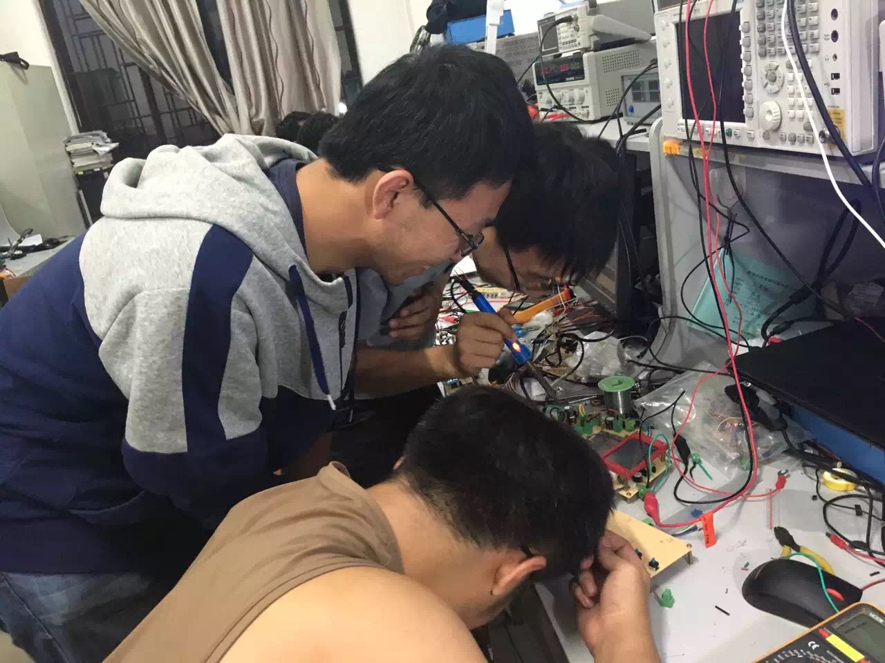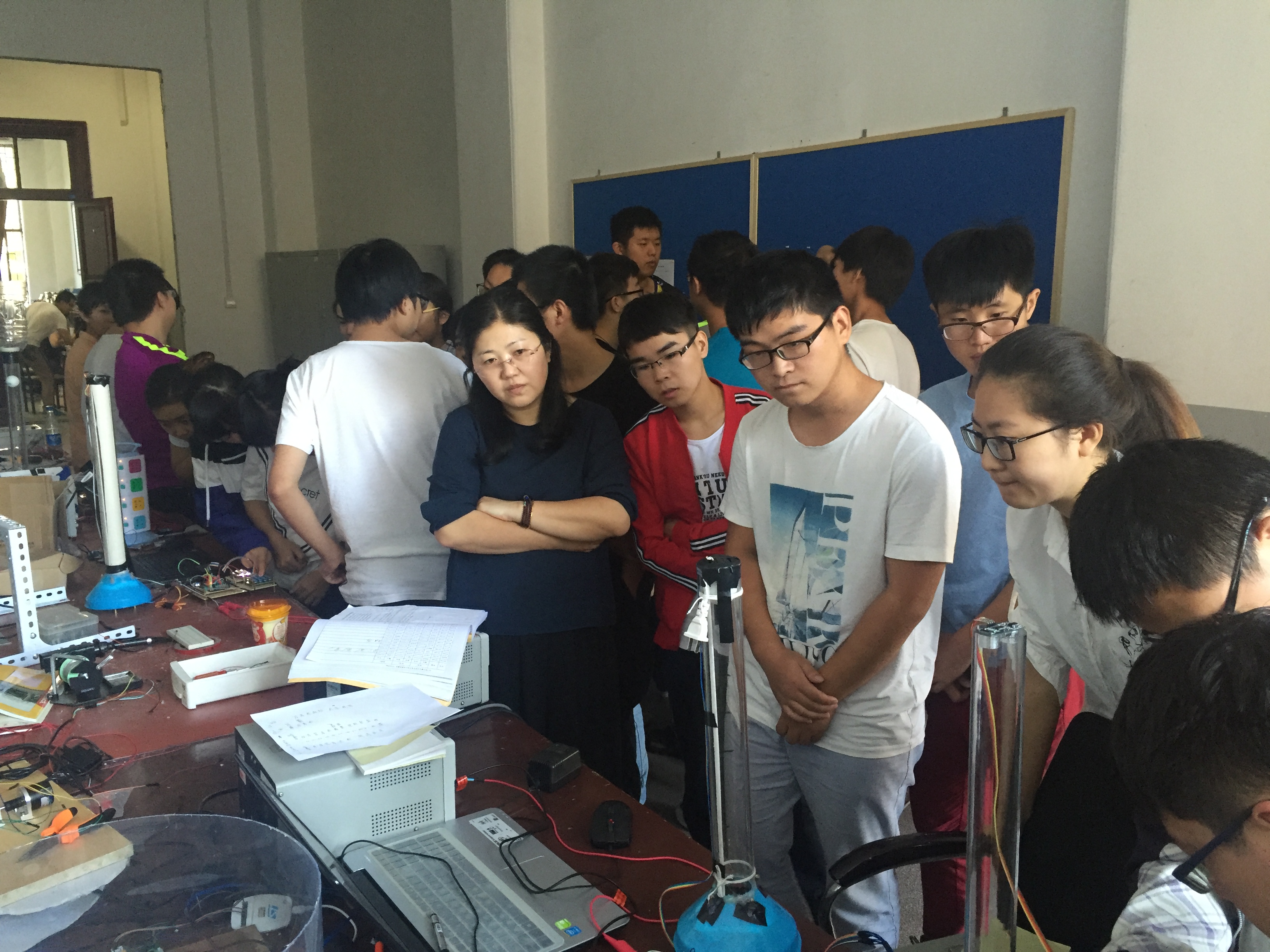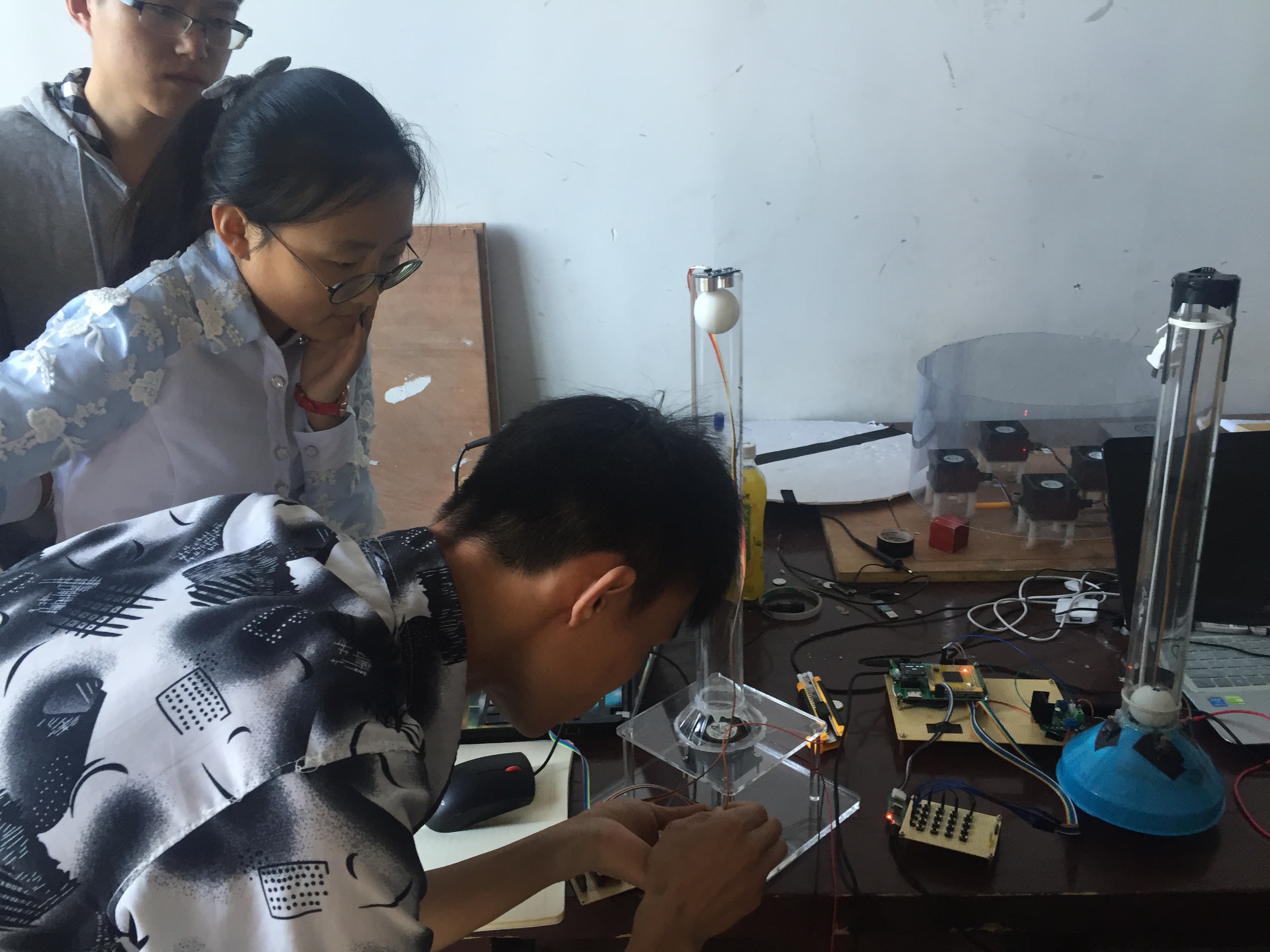 为了能圆满的完成三下乡活动之专业社会实践活动的各项任务,在为期65天的赛前培训期间,同学们充分发挥了仪电公司刻苦拼搏的精神,秉承实验室多年来精益求精的理想,始终奋斗在实验室。当中,大一新生杨洋的努力格外引人注目。作为卓越工程师班的员工,不仅追求学业成绩优秀,而且励志在实践方面也同样做到巾帼不让须眉。由于平时缺乏实践方面的培训,面对困难的她并没有气馁,反而增加了自己在实验室的时间,她用比别人多花的时间将实践方面的缺陷慢慢地补了回来。“人十能之,己百之”,正是凭借着这种精神,杨洋同学交出了一份令人满意的答卷。14级控制组为了能顺利的控制好乒乓球的悬浮,不仅自学3D打印机的使用,而且学会了利用刻板机刻制电路板,他们在目标的驱动下、老师和学长的帮助下不断地进步、不断地充实自己。此外,作为主力的13级员工也有条不紊地进行工作,不少员工为了能挤出更多的时间不惜在实验室打地铺睡觉。期间,为了检测大家在培训期间的成果,千承辉老师举行并主持了中期检查,所有员工的作品都受到了严格的审查和仔细的点评,检查过程中同学们相互交流,氛围良好。