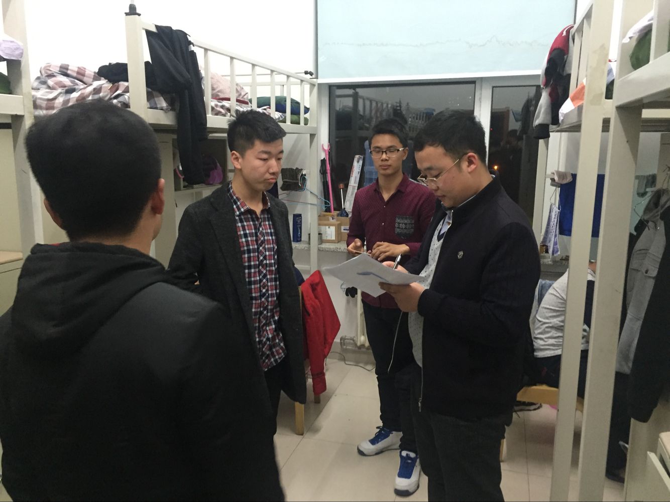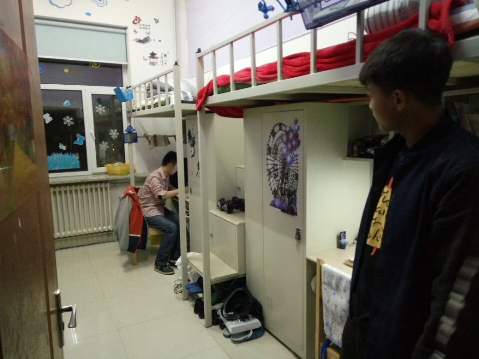 2016年3月21日21:00,2015级辅导员与员工会生活部相关人员对北苑一公寓中的2015级寝室进行了本学期第2次联合检查。此次安全卫生检查包括以下内容:室内有无私拉乱接电源电线和使用违章电器行为;室内是否干净整洁,生活用品摆放整齐;门窗是否洁净,有无附着灰尘等9项检查指标。检查过程中,张昊宇老师和员工会生活部相关人员对各个寝室安全卫生情况进行了评分,张老师对卫生干净整洁、装扮优雅美观的寝室进行了表扬;对存在的问题的寝室提出了整改方案。他号召大家将寝室作为自己的小家,像对待家人一样对待自己的同学,营造出温馨融洽的寝室氛围。本次检查共历时1个小时,通过寝室检查可以发现,2015级寝室无私拉乱接电源电线和使用违章电器行为,地面基本洁净,整体状况良好。但仍普遍存在窗台堆积杂物、附着灰尘等问题,个别寝室不注意通风,造成室内空气不清新的情况。