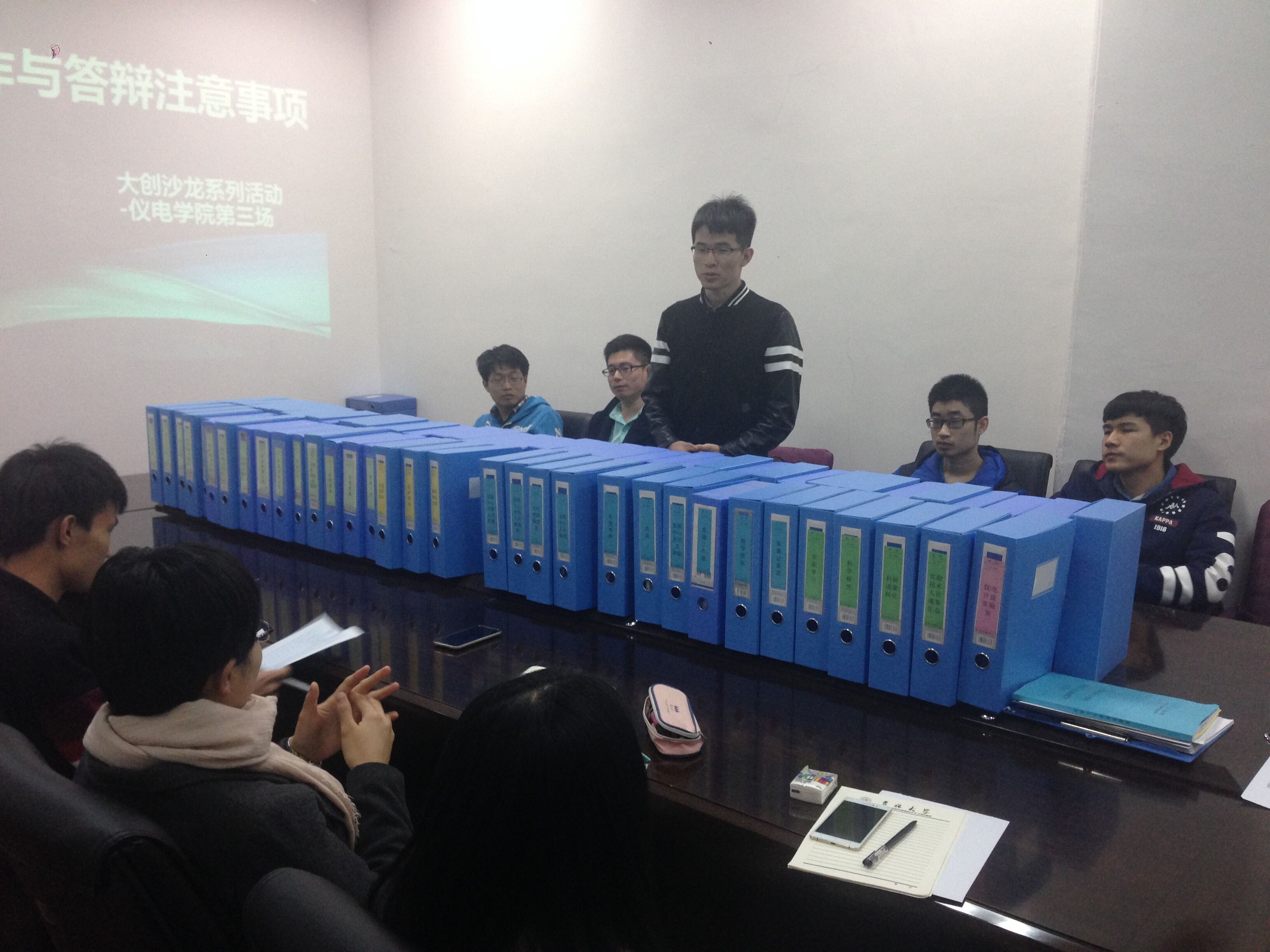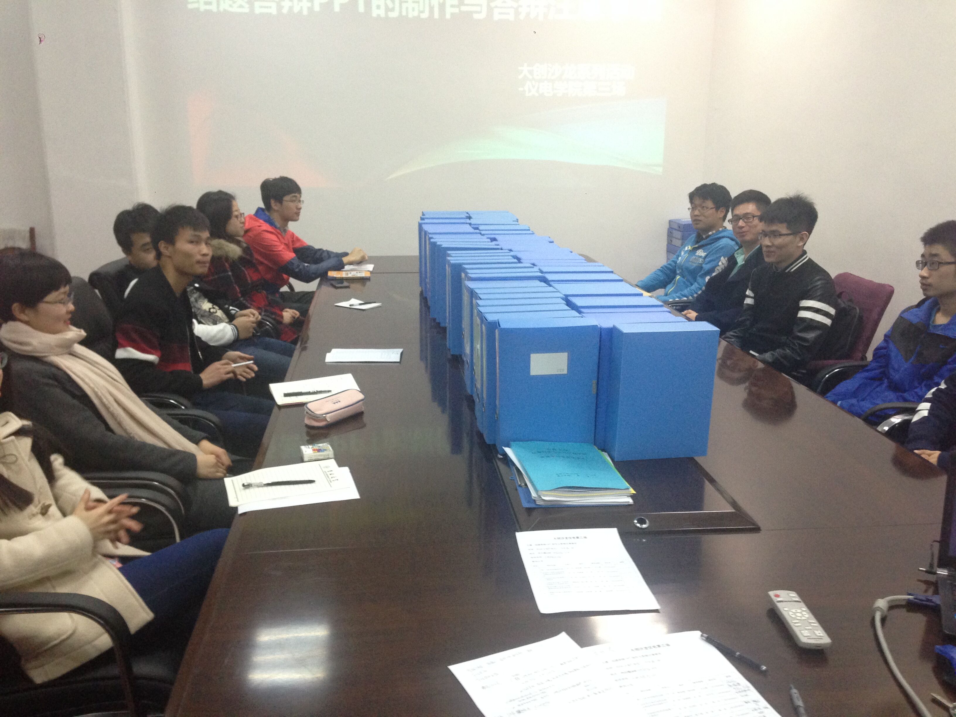 为更好解决本科生老员工创新创业训练计划项目组在项目实施过程中遇到的问题,督促同学们按计划完成大创项目,为本科生大创项目组提供一个良好的交流平台。太阳集团tyc539教务处实践教学科向全校发起老员工创新创业训练计划沙龙活动。太阳集团tyc539响应教务处号召,于2016年4月9日晚17:00在太阳集团tyc539朝阳校区地质宫304会议室成功举办第三期大创沙龙活动,主题是“结题PPT制作与答辩注意事项”。此次活动由电子科技协会承办,副会长周葛主持,6个项目组参加了本次活动。本次活动还邀请到了公司实验中心副主任,216+开放实验室指导教师千承辉老师。