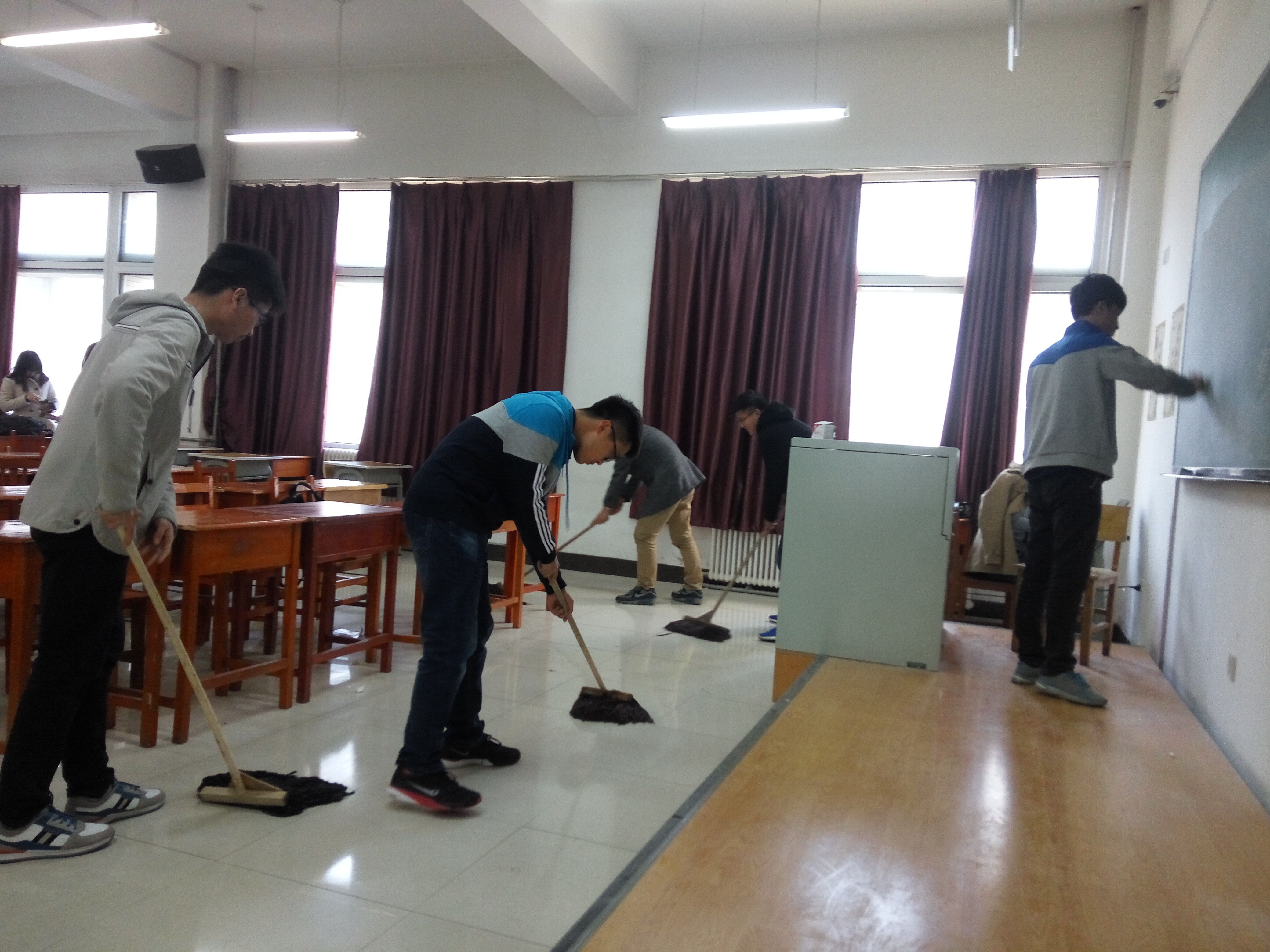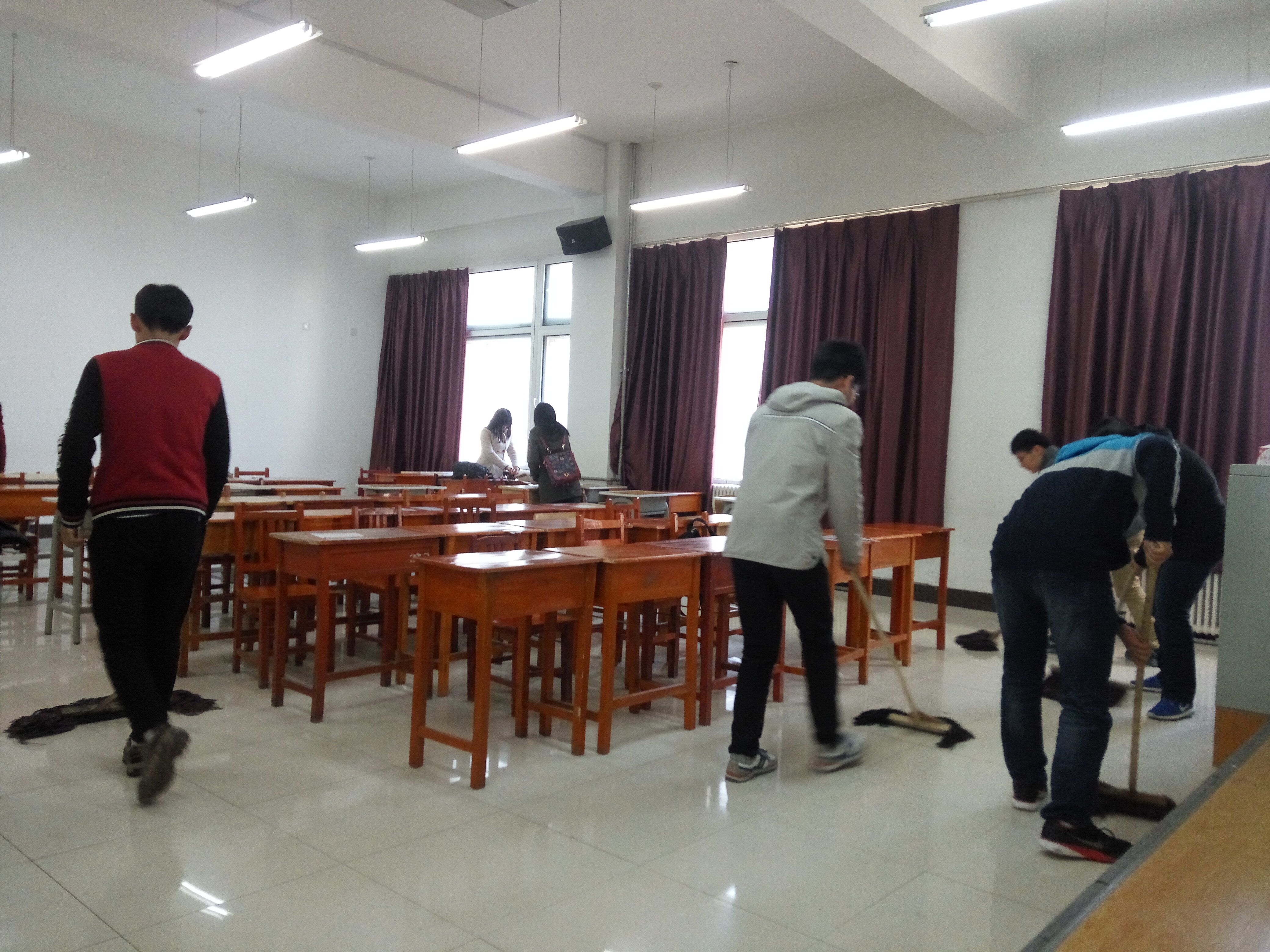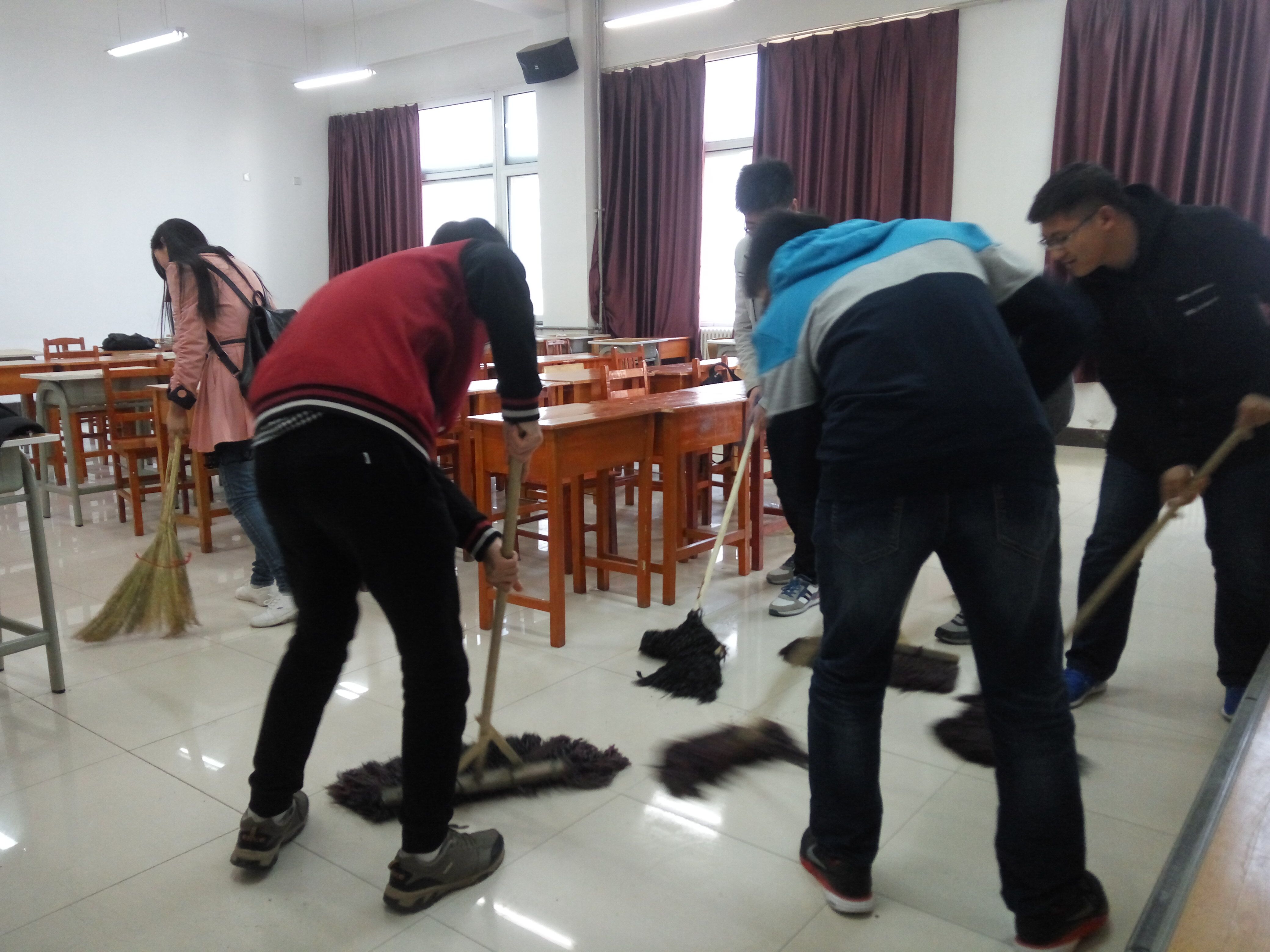 本次志愿服务活动的地点是中心校区李四光教学楼各教室。协会副部向大家分配了主要任务后,同学们马上投入到了热火朝天的清扫活动中去。大家的情绪都很高涨,他们在擦玻璃的时候把边框擦得干干净净,地面、黑板讲台的杂物也都被同学们收拾的井井有条,最后,志愿者们将教室内的桌椅摆放整齐,并清扫了教室内的纸屑垃圾,清扫之后,教室的面貌焕然一新,看着洁白如新的地板和摆放整齐的桌椅,志愿者们的脸上洋溢着幸福的笑容。
