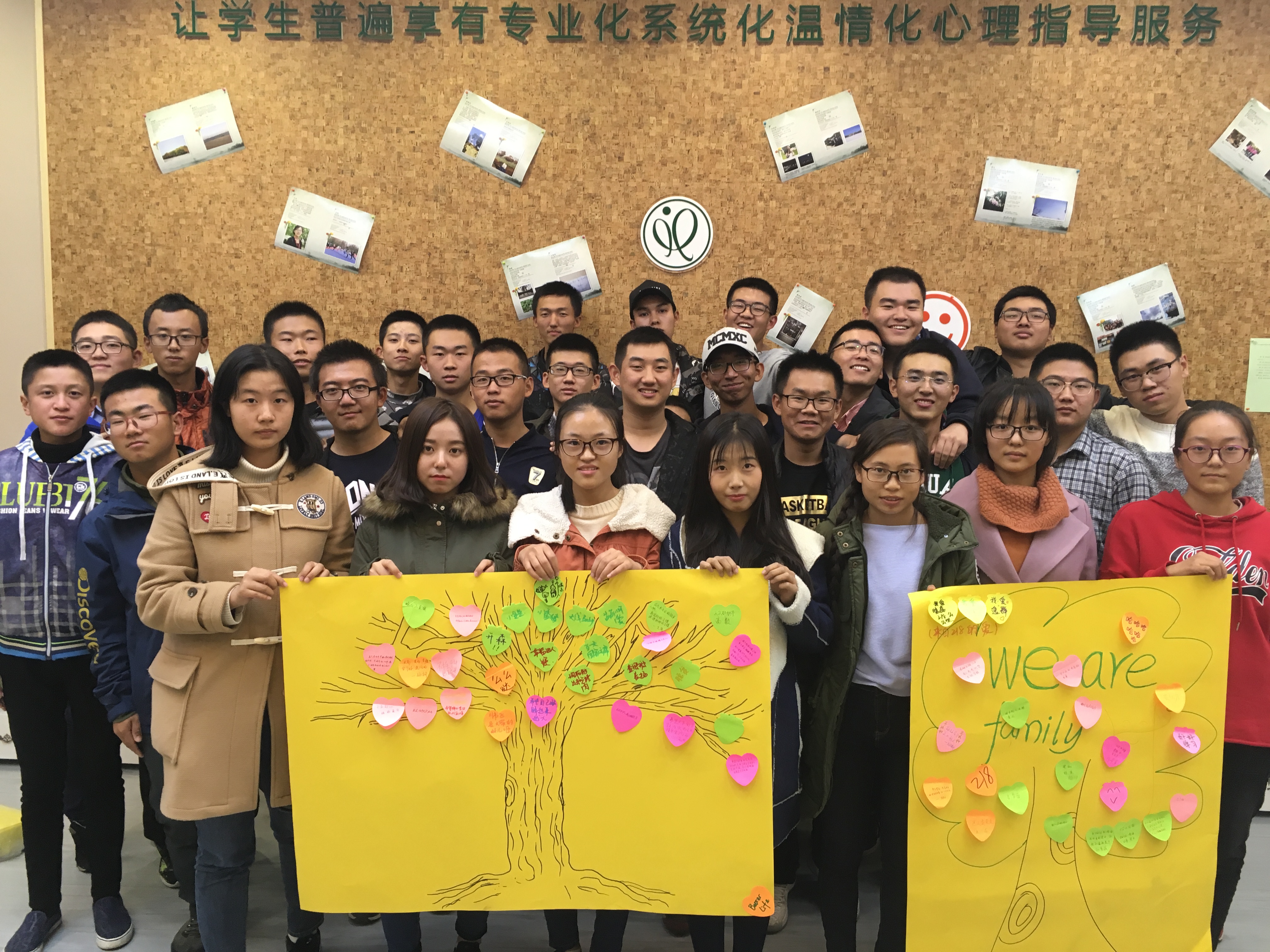 主持人在介绍了这次团体活动的主题、目的和内容后,带领大家做了几个有趣的心理游戏。第一项游戏是“一分钟鼓掌”,即估计自己一分钟的鼓掌次数并比较自己估计的次数与实际的差异。大部分同学都惊奇地发现,自己的实际情况与预想有较大差异,而该游戏的目的正是告诉大一新生要客观分析自己的状况,给自己设定合理的目标。随后进行的游戏是“集体登陆”,主持人将全班同学分成三组,在规定的三分钟时间内要求每组的成员全部站在各自组的报纸上。同学们做该项游戏的时候都十分紧张、激动、兴奋,该游戏极大地活跃了气氛,也锻炼了同学们互相协商的能力。而后大家还进行了“人椅破冰” “信任之旅”和“我知道”三项游戏,这些活动帮助大家更好更快地融入集体。在活动的最后,全班同学在画纸上画了一棵代表内心梦想、期望的“团体树”,大家的每一笔都小心翼翼,希望能画出最成功的作品。画完后同学们还在树上贴上了代表梦想的小纸条,缤纷的色彩装点了大家的大学之梦。