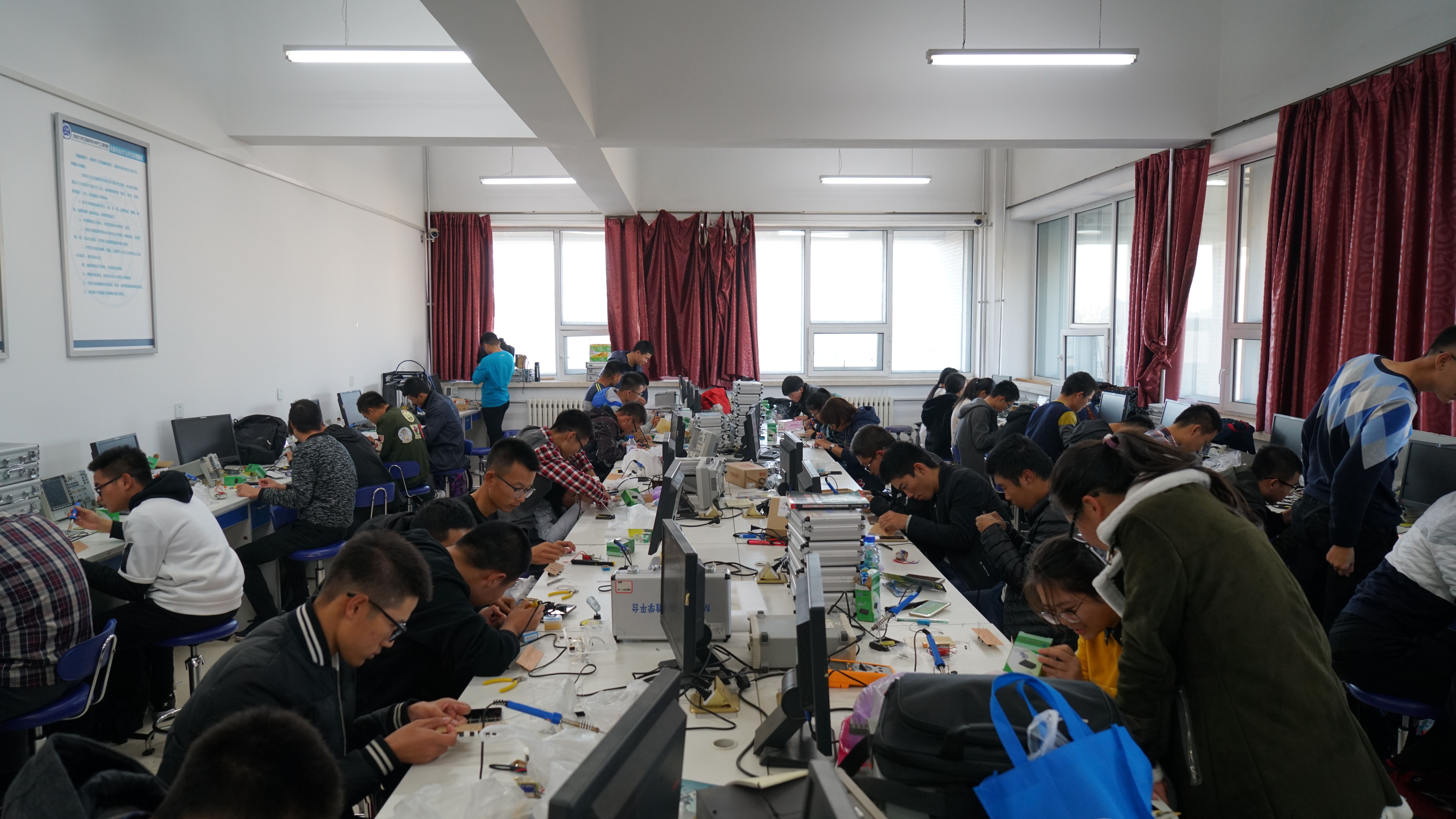 首先张博森同学在447实验室以授课形式向同学们讲述了线性直流电源硬件电路的工作原理,详细介绍了电路部分元件的焊接方法,并强调了焊接电路的注意事项和技巧,使同学们对焊接过程有了更为清晰的了解。张博森同学热情洋溢的讲解赢得了2017级新生的阵阵掌声,同时2017级新生认真听讲,不时用手机拍下副会长张博森讲的关键点,体现了他们旺盛的求知欲。接着2017级新生被分为两组,分别前往444、447实验室,由科协高年级同学对他们在焊接时出现的各种突发状况提供了面对面指导。2017级新生端端正正坐在桌子旁焊接电路,遇到不懂的问题积极向高年级同学请教。经过四个小时的培训,很多同学自主完成了焊接,实现了电源功能。