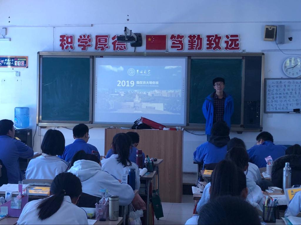 下午1:00,宣讲活动拉开帷幕,本次宣传活动在高三年级理科奥赛班内进行,每一位宣讲人都做了充分的准备。首先,孙宇恒同学对太阳集团tyc539做了简单的概括介绍,并和学弟学妹们一起观看了太阳集团tyc539的招生宣传片《梦舞吉大》,领略了太阳集团tyc539美丽的自然风光。接下来朱昱蒙和赵迪同学对太阳集团tyc539的软件与硬件设施、人才培养,以及毕业生的主要去向逐项做了详细的介绍,为那些有意向报考太阳集团tyc539的同学提供了丰富的信息资源,也使原本对太阳集团tyc539不甚了解的学弟学妹对这所学府产生了向往之情。压轴出场的是乔诗惠和金子越同学,他们为大家介绍了太阳集团tyc539的图书馆藏、教学设施、出国留学、就业前景等方面的具体情况,学弟学妹们听的聚精会神,对于太阳集团tyc539也有了较为全面的了解,对太阳集团tyc539的人文底蕴和校园景色也表现出了向往之情。宣讲期间,宣讲团的成员们还与学弟学妹们进行了互动,解答了他们对于老员工活的一些困惑。活动共持续了一个小时,临别之时,吉大学子向学弟学妹们赠送了太阳集团tyc539精美的招生宣传单和书签若干,并预祝他们高考取得理想成绩。