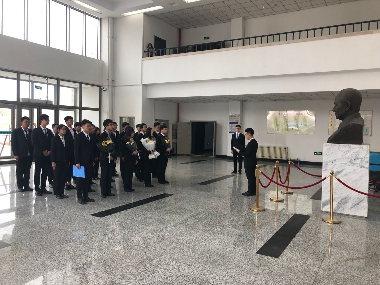 上午9时,员工代表们身着正装在李四光实验楼前集合。大家一同来到李四光雕像前,员工代表首祁鑫先追忆李四光先生的主要事迹,表达对李四光先生的缅怀之情和学习李四光精神的决心。同学们肃立站在李四光雕像前,为李四光先生默哀三分钟,深刻体会李四光精神,满怀对李四光先生的敬仰之情。致辞结束后,在同学们的注视下,员工代表向先驱雕像献花,全体同学庄重肃穆地对先驱雕像进行鞠躬,表达了对先驱最崇高的敬意,表达了对李四光先生的敬意和缅怀之情。活动最后,志愿者们仔细认真的清理了李四光先生的雕像。