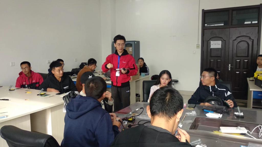 本次活动主要面向2019级员工,科协会长周原锐同学担任主讲。周原锐同学首先介绍本次活动所用器件,讲解基本电子元件的原理,为同学们展示了焊接成品随后,2017级志愿者的协助下,同学们纷纷开始了自己的“焊接之旅”。遇到问题时,志愿者从旁协助,耐心解答问题,最终,同学们都完成了自己的作品。在活动最后,志愿者组织同学们用焊接成品组成“新中国密码”——“15665 611612”。这串数字是歌曲《没有共产党就没有新中国》第一句旋律的简谱,蕴含着浓浓爱国情。