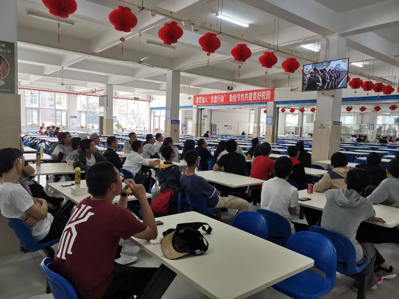 随后,马姗姗老师与2019级共青团员代表在前卫南区基础园餐厅一同观看庆祝中华人民共和国成立70周年阅兵式直播,全体师生聚精会神,认真收看,两个多小时的阅兵结束时,大家意犹未尽,纷纷畅谈体会,现场气氛十分热烈。